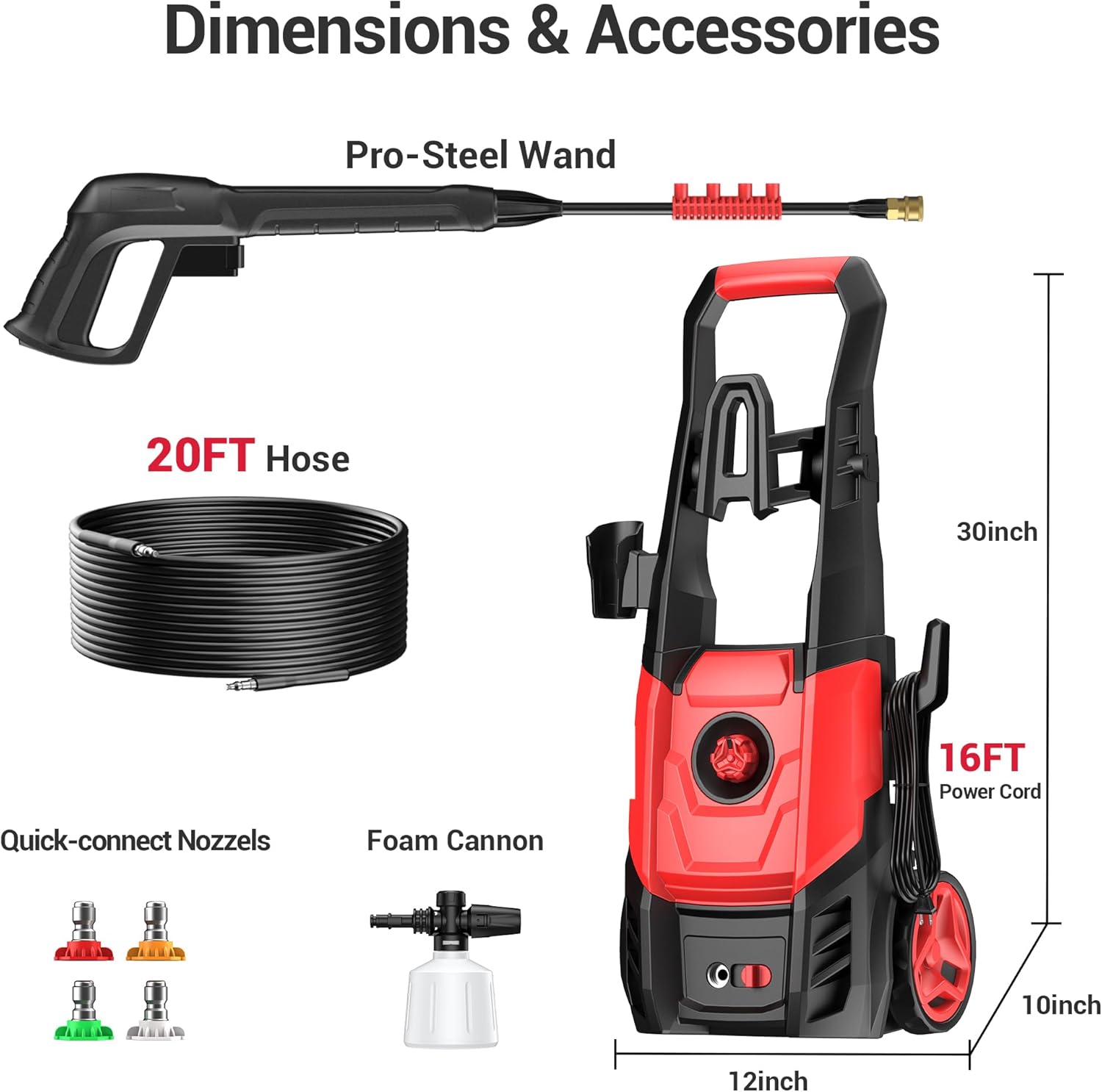 Electric Pressure Washer, 2.5 GPM Power Washer with Foam Cannon, Electric High Pressure Washer with 4 Quick Connect Nozzles for Cars, Driveways, Fences, Patios, Home Cleaning