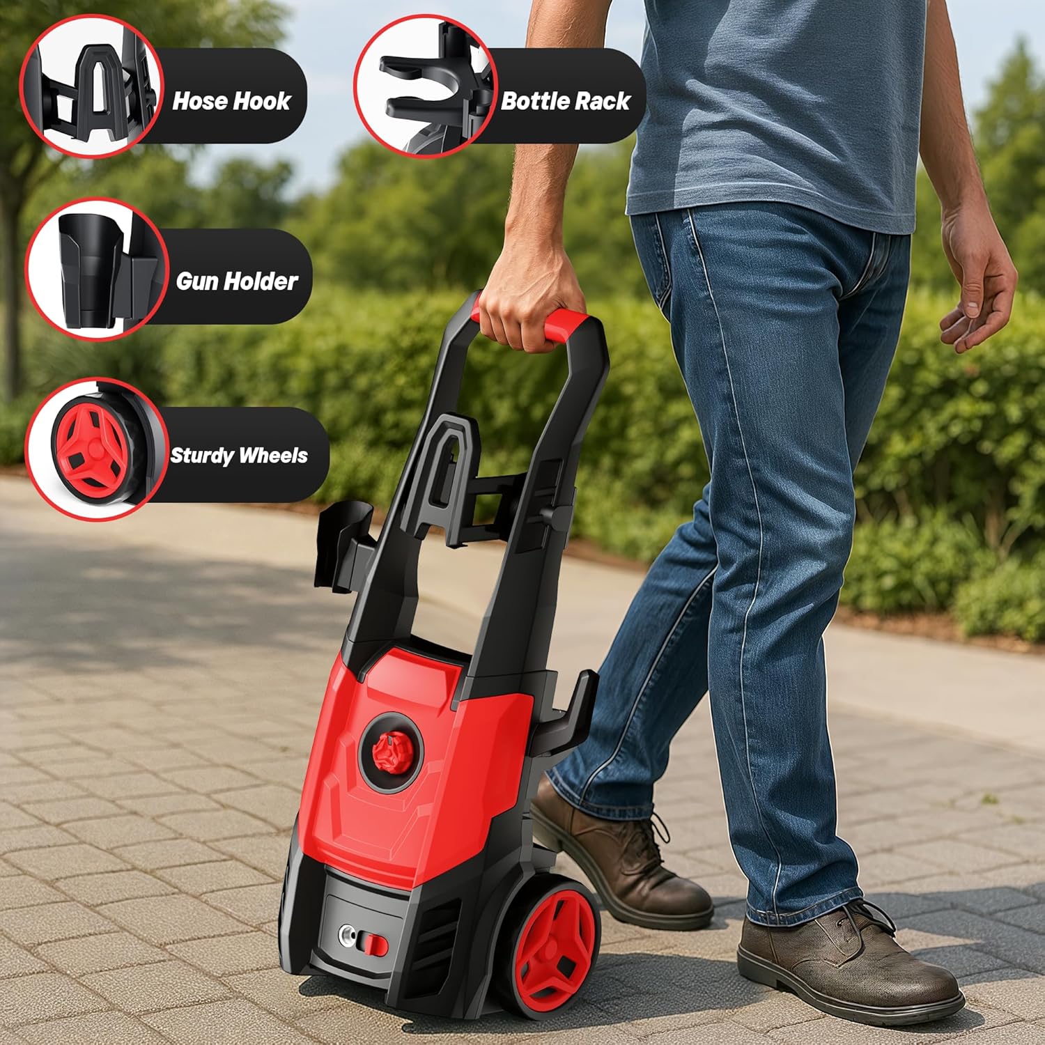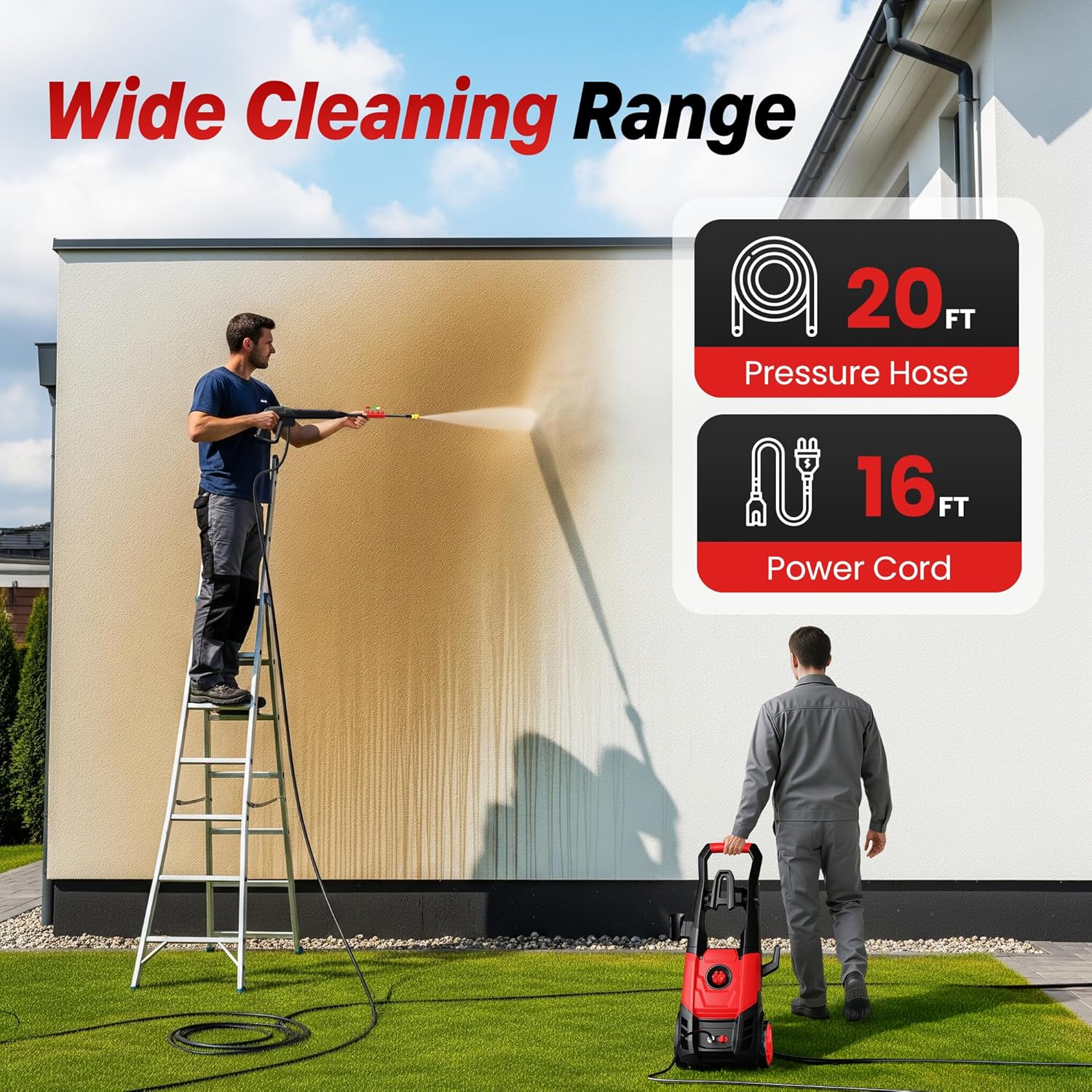 Easy to Use and Move: Portable pressure washer comes with a 20 FT hose and a 16 FT power cord, which are long enough to ensure free movement. The double wheels are smooth and durable, making it easy to move around. The anti-dumping design of the body increases stability during use. In addition, it can take water from both a faucet and a bucket, making it easy to create a clean space wherever you want