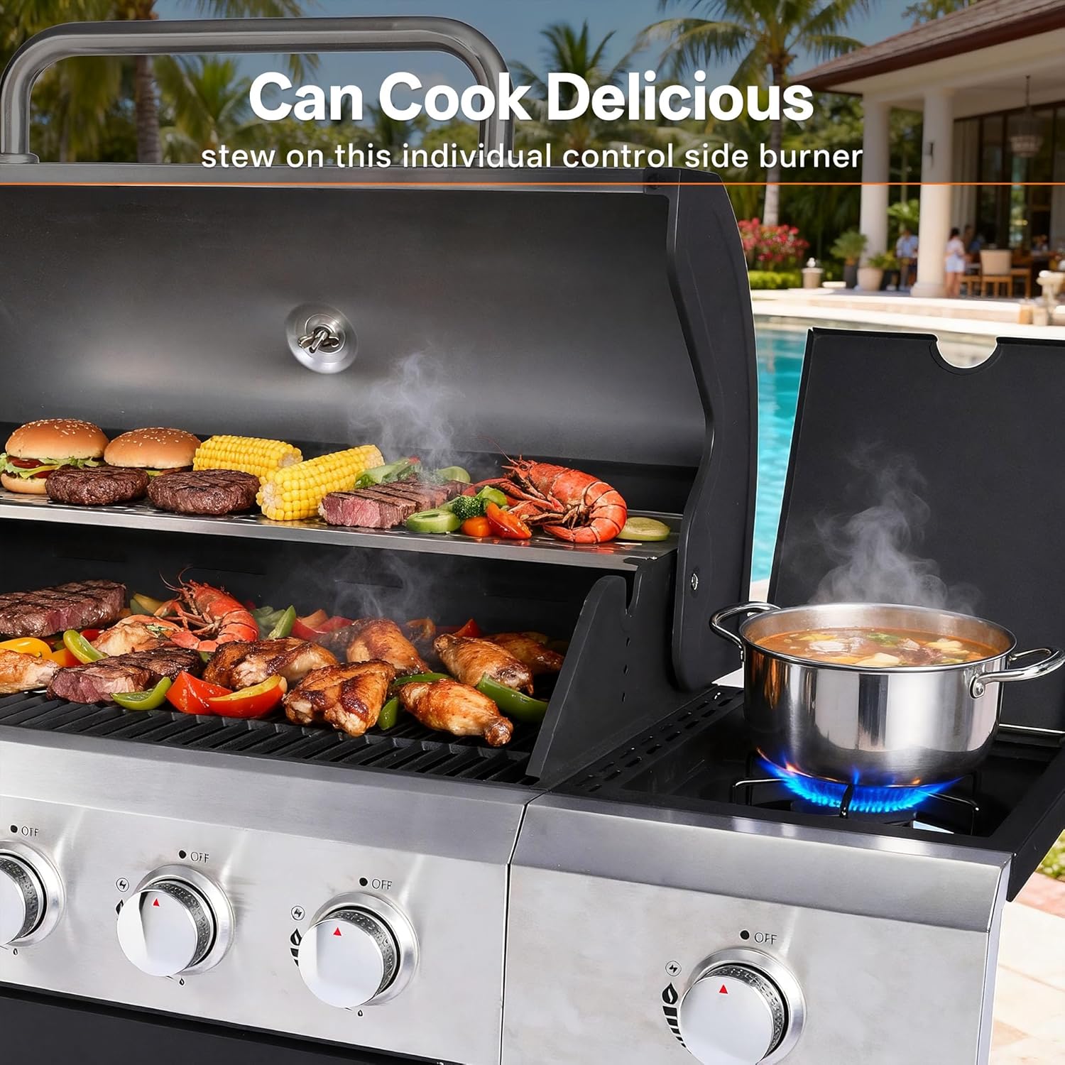 [Powerful Burners] Engineered for robust performance, this Gas Grill delivers 58,500 BTUs across five stainless steel burners for uniform searing, plus an 8,500 BTU side stove burner—making it a true gas grill with side burner for sauces or boiling water. With piezoelectric ignition and precision knobs, this propane grill excels in outdoor cooking, ensuring flawless flame control every time