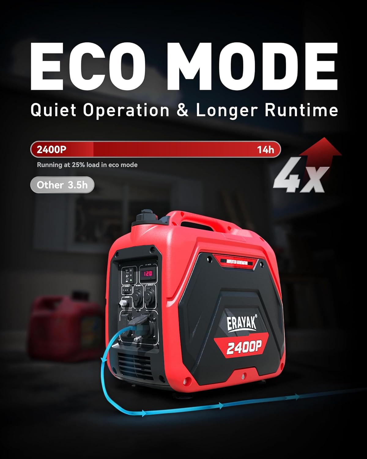 Quiet Generator: Ultra-quiet operation at just 52.5 dB(7meters distance & 25% load)—perfect for campgrounds, RV parks, and residential areas. Eco Mode dynamically adjusts engine speed to optimize fuel efficiency and reduce noise.