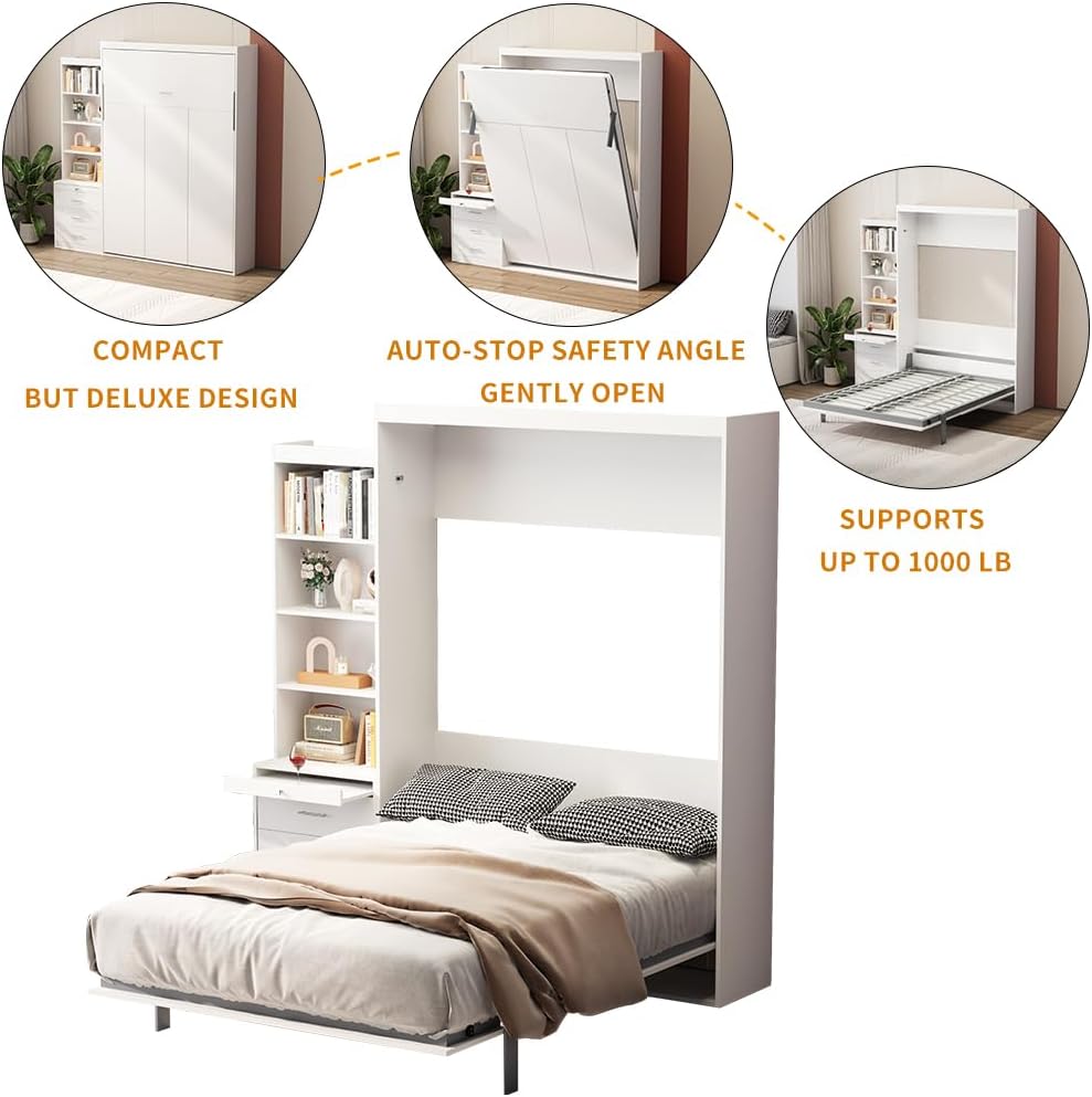 Favfurish Full Size Murphy Bed Chest, with Shelf and Drawers Wall Bed Space Saving Hidden Bed,can be Folded, Solid Pine Platform Bedframe,for Home, Office, Small Room, Living Room,Guest Room,White