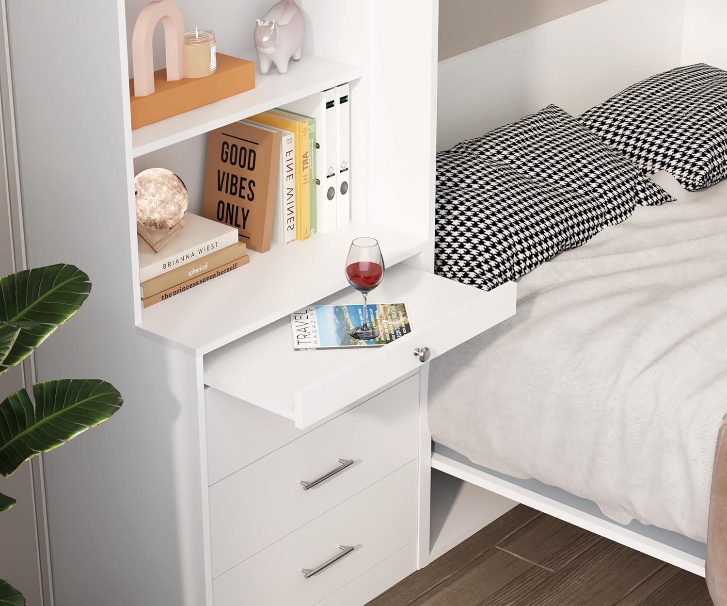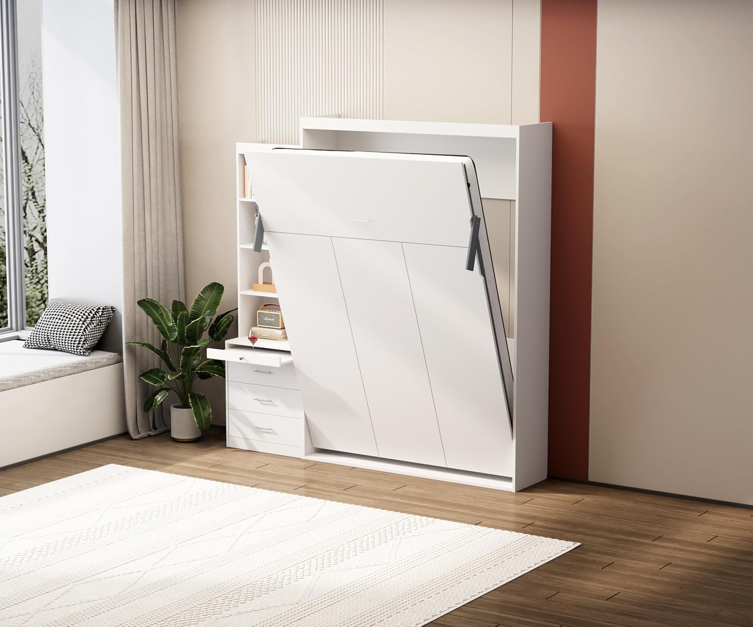 【Convenient Storage Shelf】: This murphy bed with desk features a storage rack with drawers, providing ample space to store your essentials. The built-in shelf keeps your items accessible and organized, enhancing the functionality of this cabinet bed.