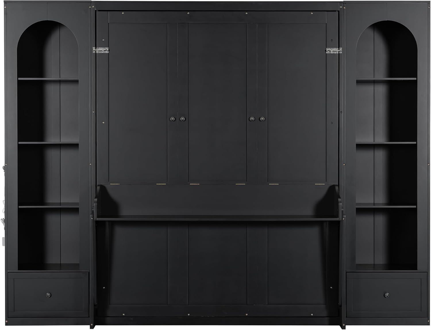 French Style Queen Size Murphy Bed with LED Lights & Storage Shelves – Wall Bed with Bookshelves, Drawers and Desk Space (Black2)