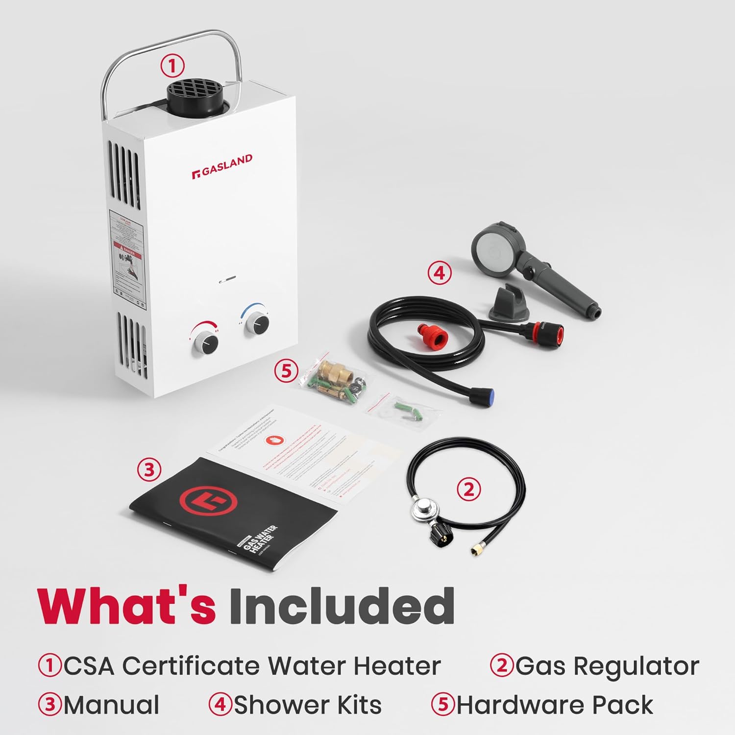 𝗪𝗵𝗮𝘁’𝘀 𝗜𝗻𝗰𝗹𝘂𝗱𝗲𝗱 – GASLAND BS158 Tankless Water Heater, CSA certified gas regulator and hose,5 feet On/Off Switch Shower Head, mounting hardware, garden hose adapter, Manual.