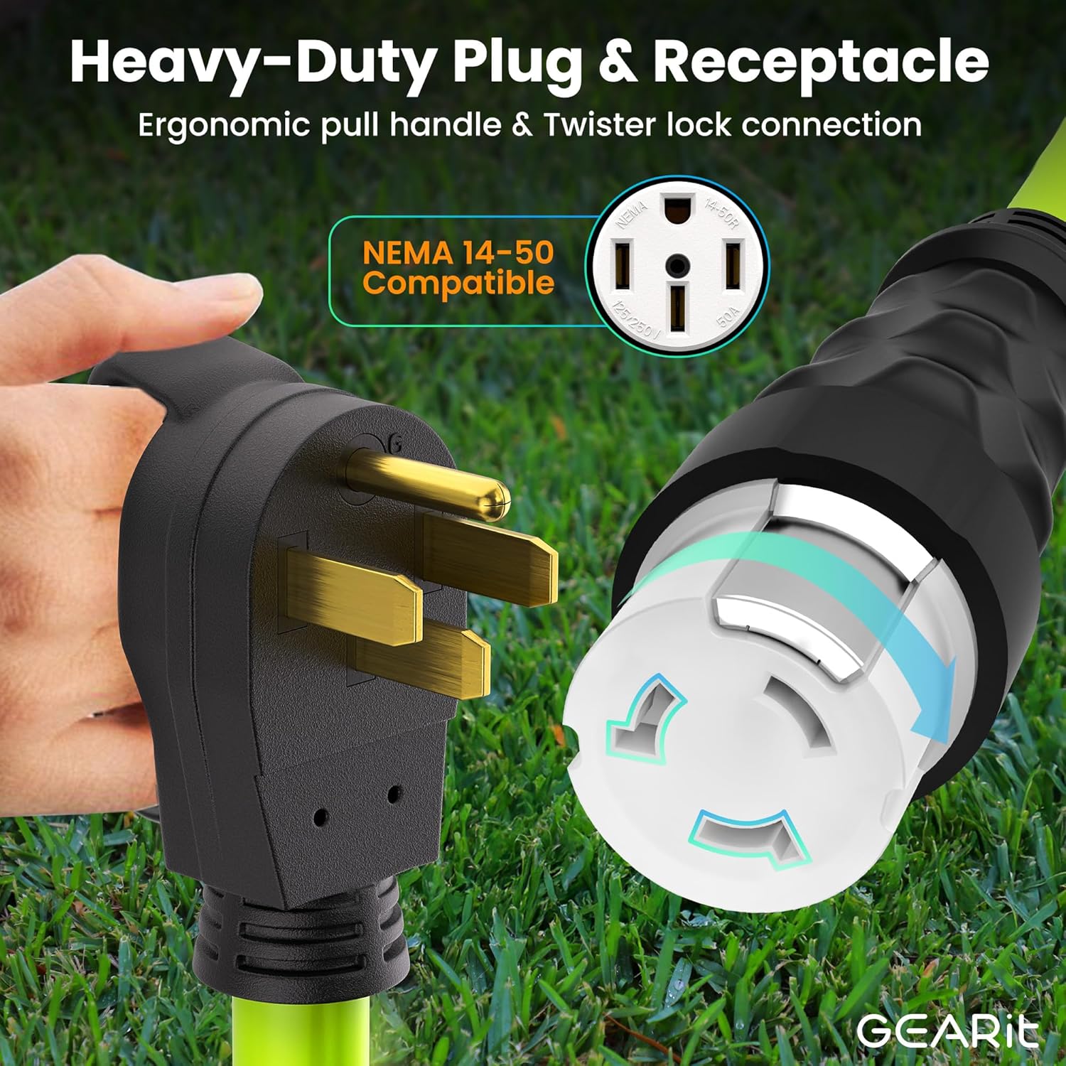 DESIGNED FOR EASABILITY – Male end of the NEMA 14-50P cord is designed with ergonomic grip handles to safely and easily plug and unplug connector, female receptacle locking feature to ensures safe and leak free power conduction.