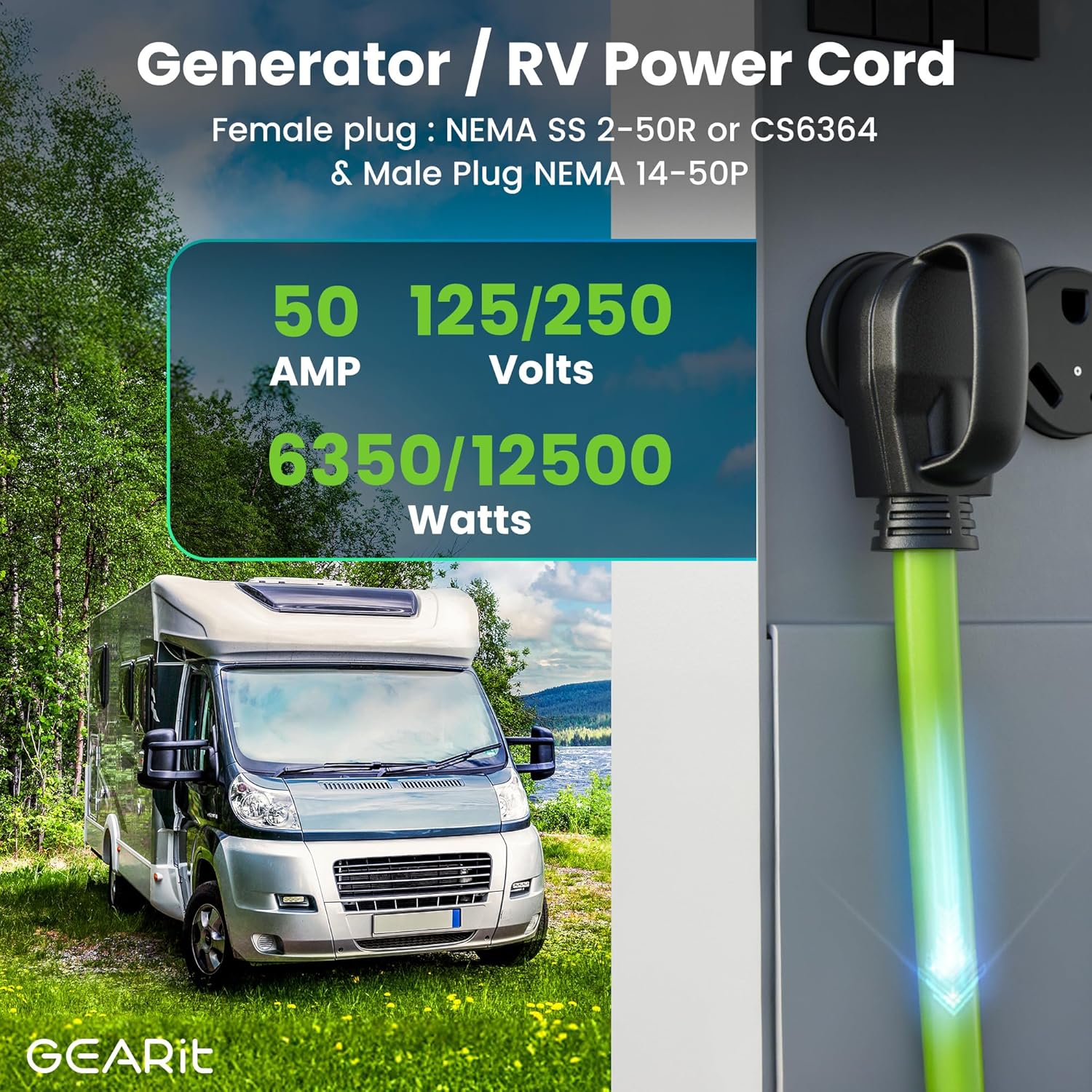 POWERFUL DESIGN – GEARit NEMA 14-50P to SS2-50R – 50A, 125/250V electrical power cord designed specifically to allow you to connect the campground or generator power to your RV, Motorhome, Trailer or vehicle with built-in SS2-50P inlet