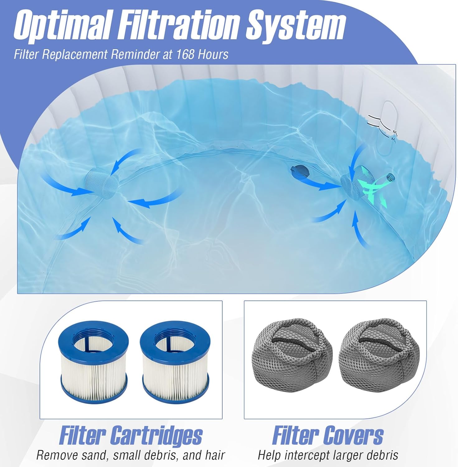 🫧【Efficient Filtration System】 After simply setting up the 2 filter cartridges and their covers, the blowup hot tub is capable of filtering out sand, hair, and debris from the water with high efficiency. In addition, the system thoughtfully alerts you to change the filter cartridges after 168 hours of diligent filtration.