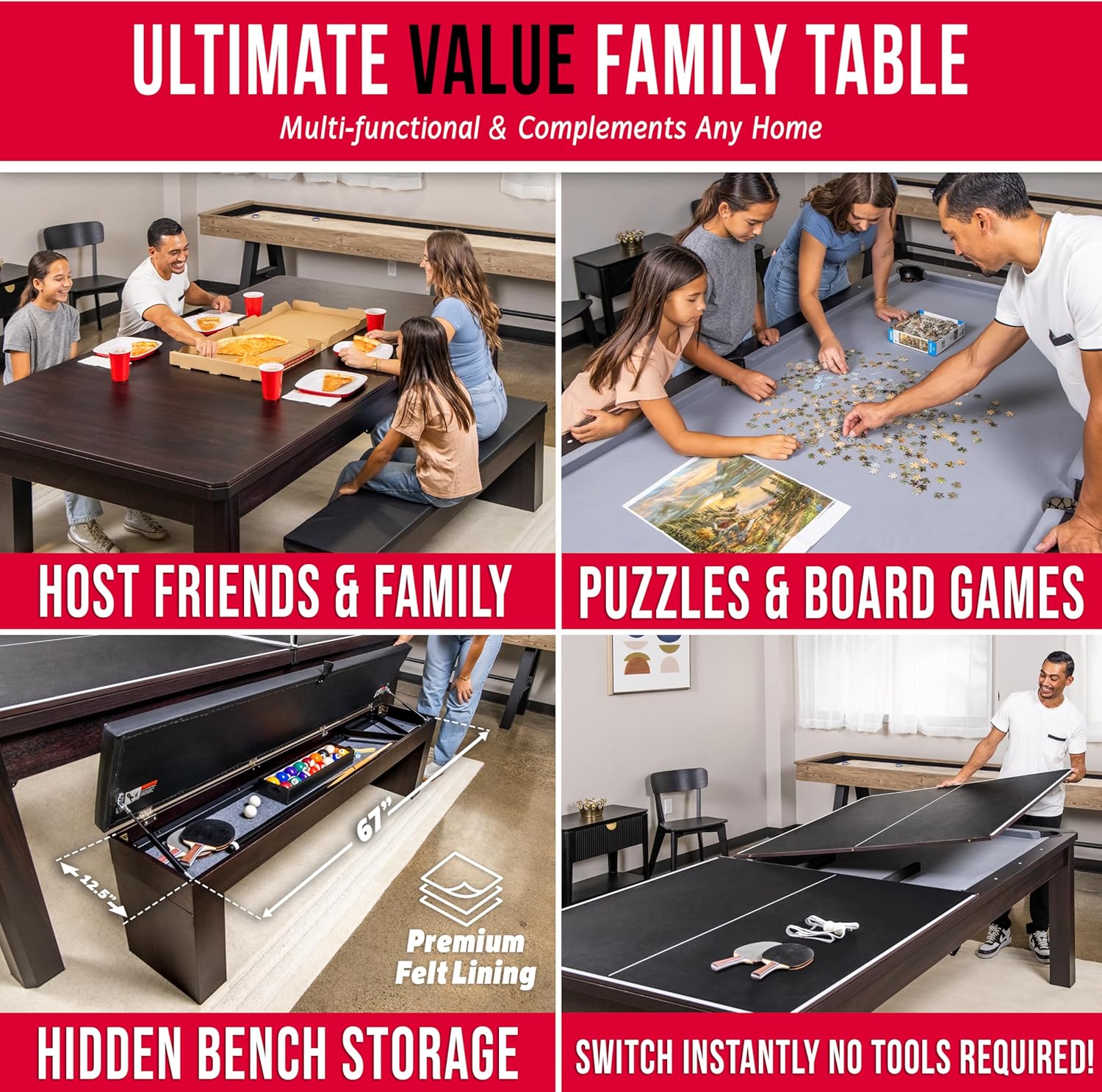 SWITCH IN SECONDS: No tools required; Simply remove the conversion top for games of billiards, or flip it to instantly switch between table tennis and dining; Also great as a puzzle and board game table for entertaining friends & family