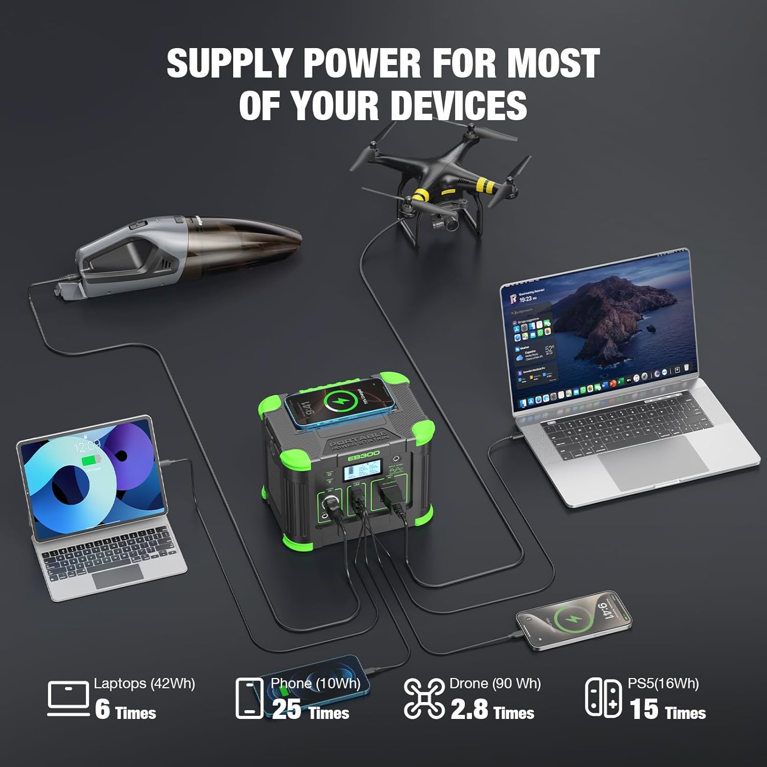 【Power Your Expectations】 Featuring 1* AC outlet, 1* PD 60W USB-C output port, 3* USB-A Output fast charge 3.0 port, 1* DC car port, 2*DC 5521 output port and support 5W wireless charge, Portable Power Station can charge (up to) 9 devices (e.g.Cameras, etc.) at the same time to satisfy your outdoor needs.