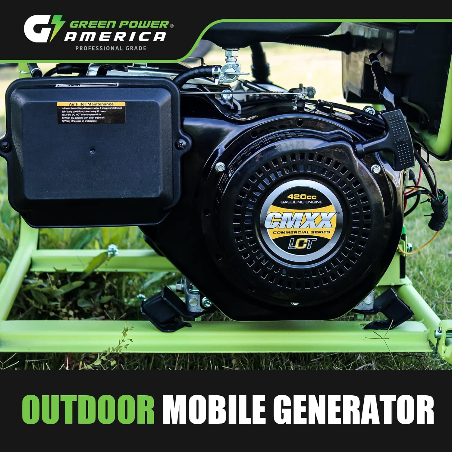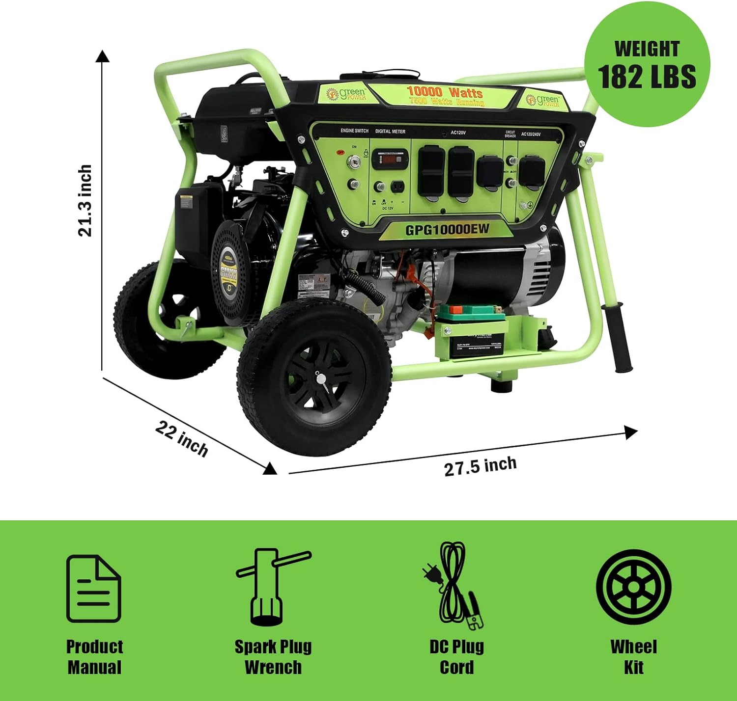 Green-Power America GPG10000EW Pro Series Recoil Electric Start Generator – 10,000-Watt is designed for home, emergency, and recreational use. It offers 10,000-Starting Watts and 7,500-Running Watts. It includes a 6.6G gasoline tank. It has been approved by the EPA. Green-Power America products are built to the highest quality standards and specifications. Focused Engineering is placed on Quality, Durability, Innovation, and Longevity. Green-Power America utilizes only the best materials available. Green-Power America, LLC is an American based company focused on the service and support of the North American market. WE POWER YOUR WORLD!