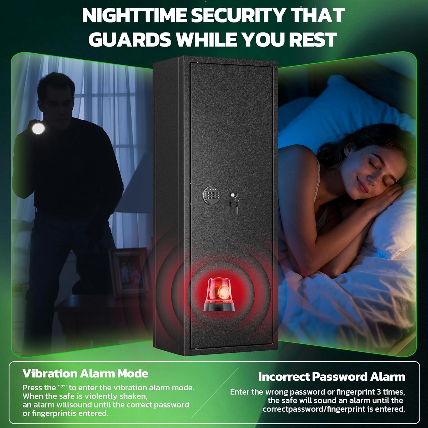 [Digital Combination Lock] Greenvelly gun safe comes with a digital combination lock, you can set 3-8 numbers as the password. You can know whether the door is open or closed by the indicator light on the combination lock, and you can also know whether the battery is in low battery. The digital combination lock can be recharged when the battery is low. In case of emergency, you can also open the locking gun cabinet directly with the 2 mechanical keys we provide.