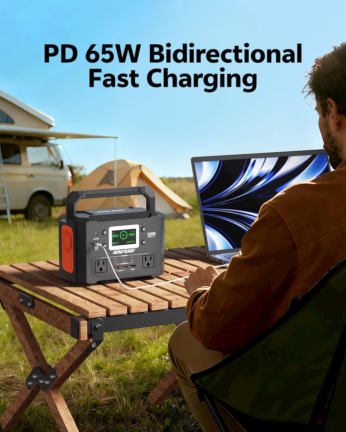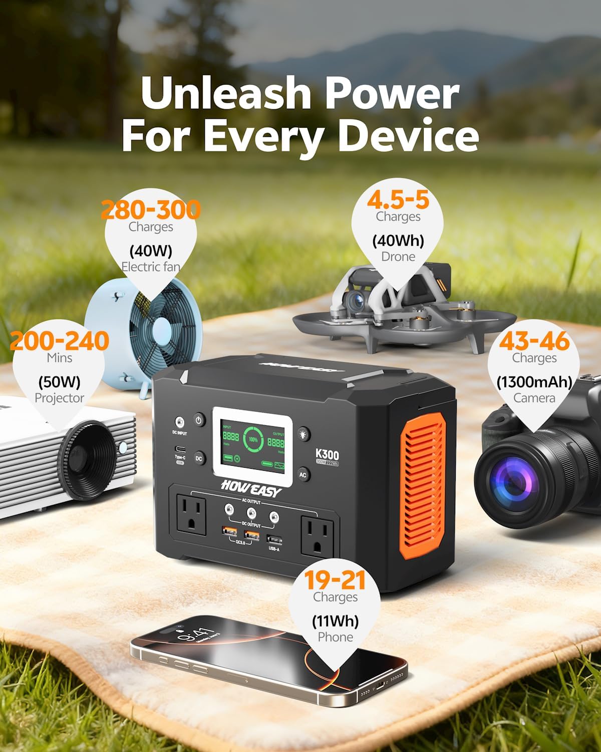 9 devices operating simultaneously: The portable power station is equipped with 2 * QC 3.0 USB ports, 1 * USB ports (5V 2.4A), 1 * USB-C 65W port, 3 * DC ports (12/10A), 2 * 3 pole output sockets (300W)