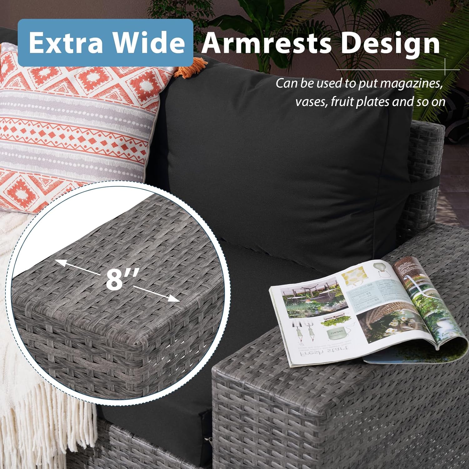 Enhanced Comfort with 8” Wide Armrest: Our 7-Piece outdoor sectional sofas greatly increases the width of the armrests. The 8-inch width not only provides a super-comfortable resting place for your hands, but it can also be used as a side table for laptops, coffee, books, and etc.,