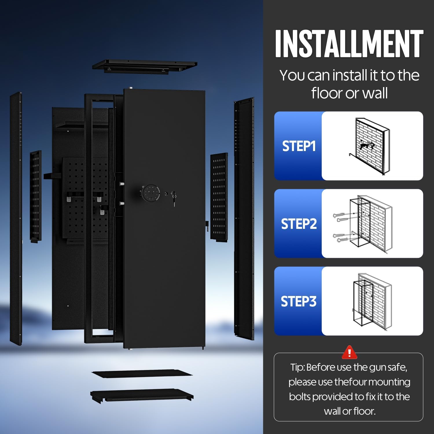 STEEL Gun Safes & Cabinets : This rifle safes for home crafted from 16-gauge cold-rolled steel, delivers unmatched durability. The gun safes for home have triple locking bolts, 20MM solid steel deadbolts, and reinforced door provide anti-theft, anti-prying, and tamper-resistant protection.