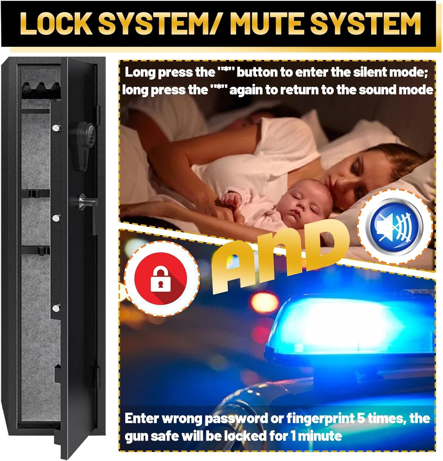 【Three Modes of Entry Gun Rifle Safe】Three ways to open the door! Our gun cabinet is equipped with one-touch biometric system and 9-digit PIN number, we also provides 2 emergency keys and emergency power for quick access. Make sure to keep the emergency keys and power out of your safe in case the battery die.