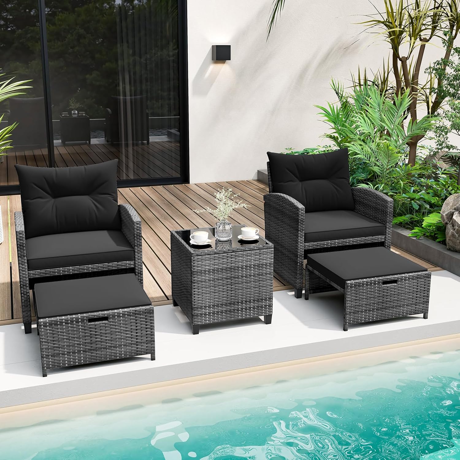 【Elevate Your Outdoor Space】Transform your balcony, poolside, or garden with this elegant 5-piece patio conversation set. Featuring 2 cozy wicker chairs, 2 ottomans, and a chic tempered glass top coffee table, it creates a perfect blend of casual luxury for both indoor and outdoor use.