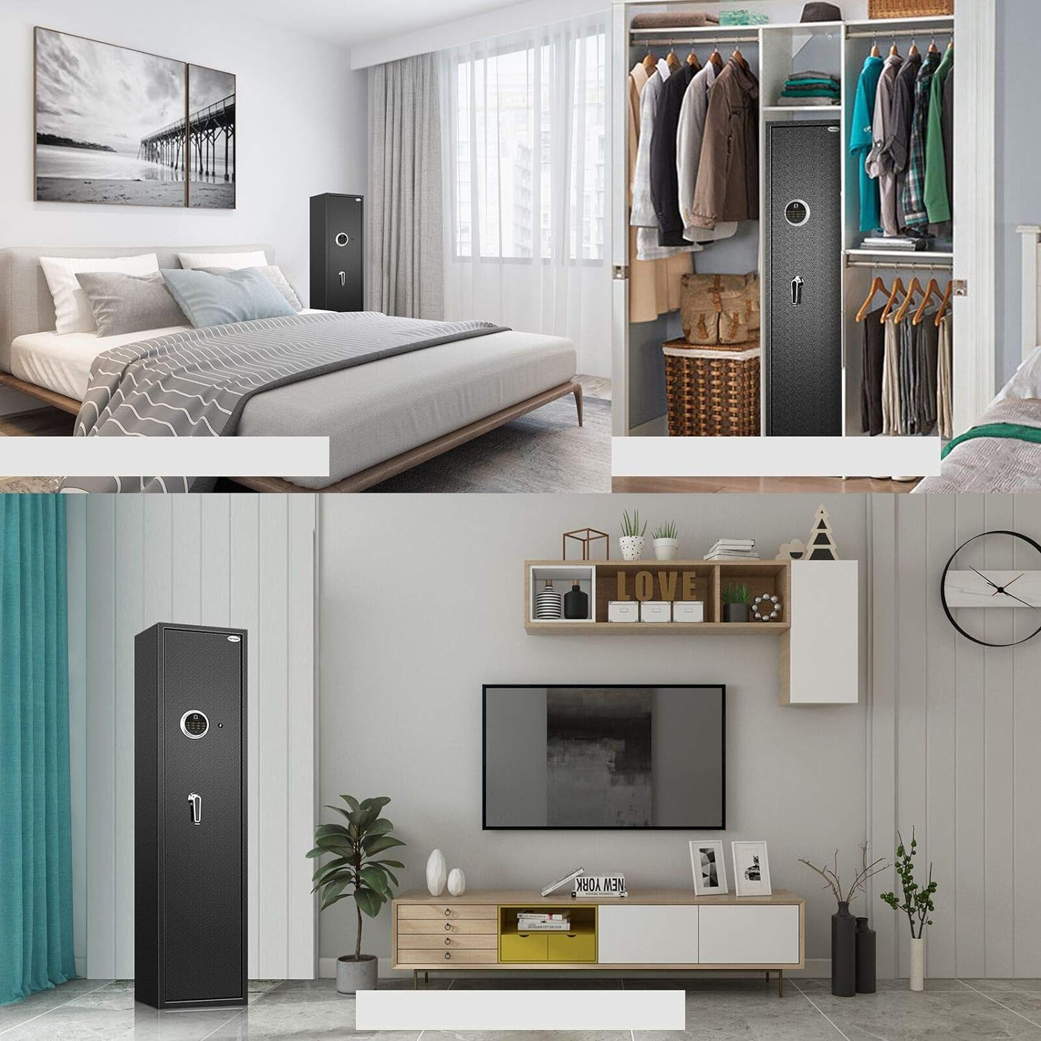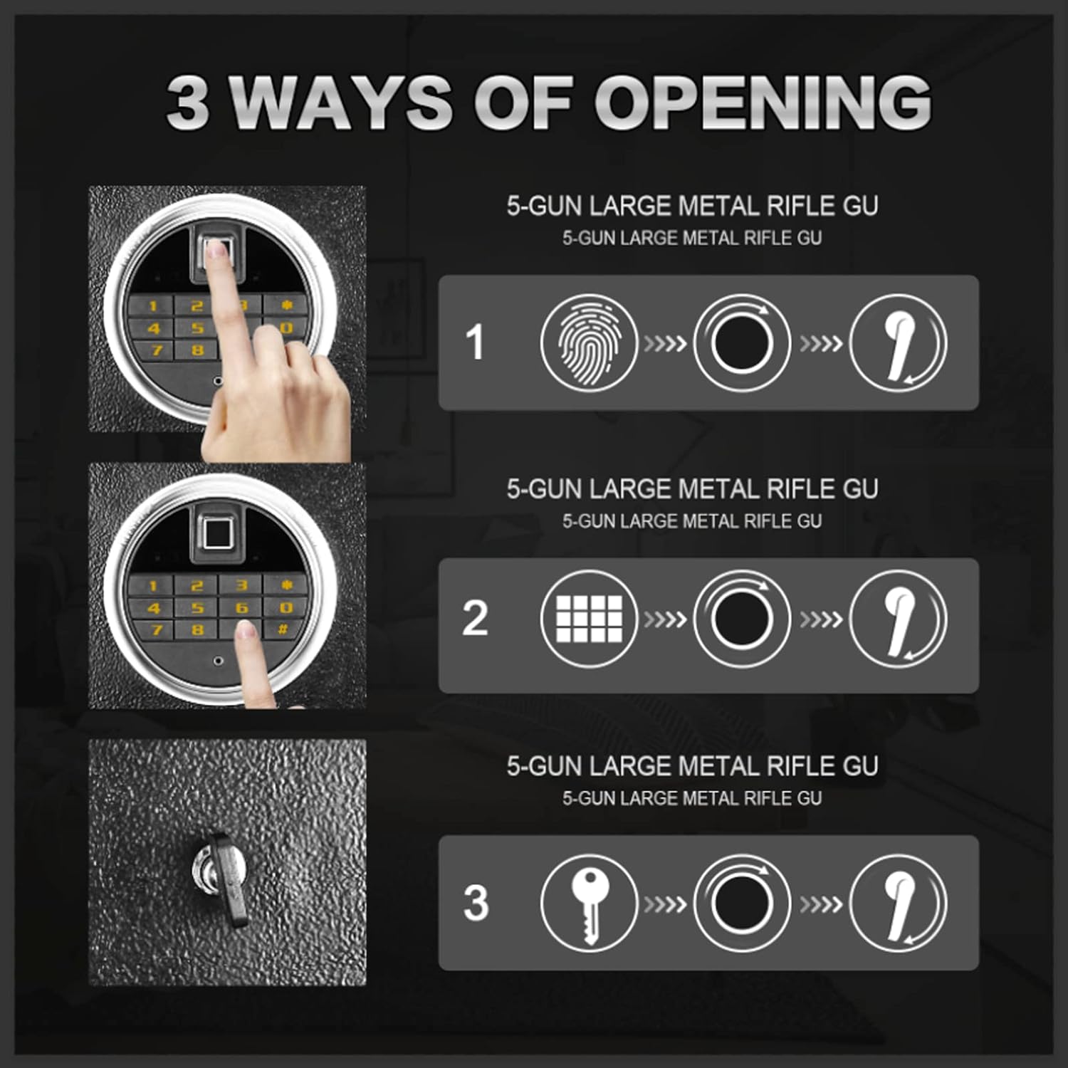 【Quick Access Biometric Rifle Safe】Biometric Rifle Safe stores up to 5 rifles and some handguns,is designed for quick firearm access during emergencies.Stores up to 100 Fingerprints and feel confident protecting your firearms, It is good for preventing unwanted visitors or your children from accessing your guns. With a biometric fingerprint safe, you no longer need to remember a combination or carry a key. Everything you need is right at your fingertips!
