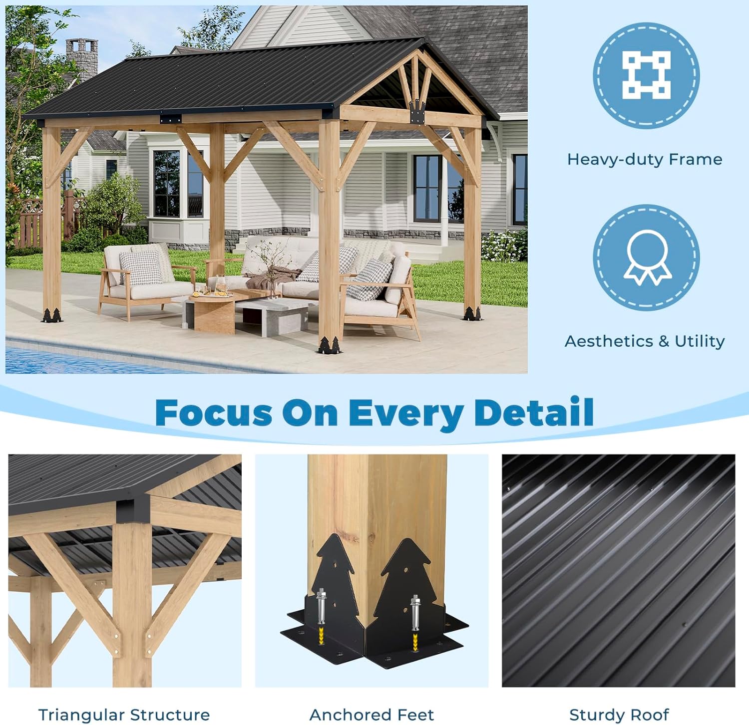 All-Weather Suitable: This 10′ x 12′ wooden gazebo features a cleverly designed galvanized steel roof that slopes effectively to allow rain and snow to slide off effortlessly. This design protects the pavilion gazebo from water pooling, safeguarding its structural integrity throughout various weather conditions.