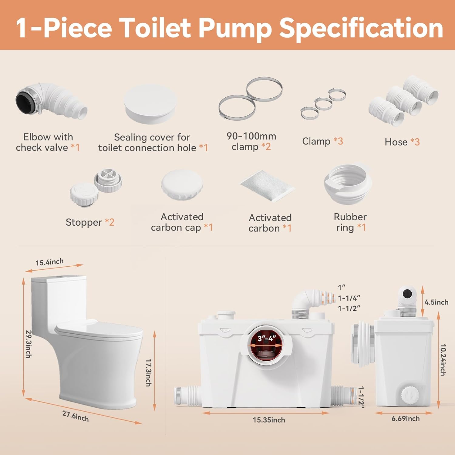 Macerating Toilet with Pump For Basement System, One Piece Full Skirt Modern Toilet, 4 Inlets Upflow Pump, Silent Seat, 23ft Upflush, Super Quiet Operation, Dual-Deodorization, 17.3inch ADA Height