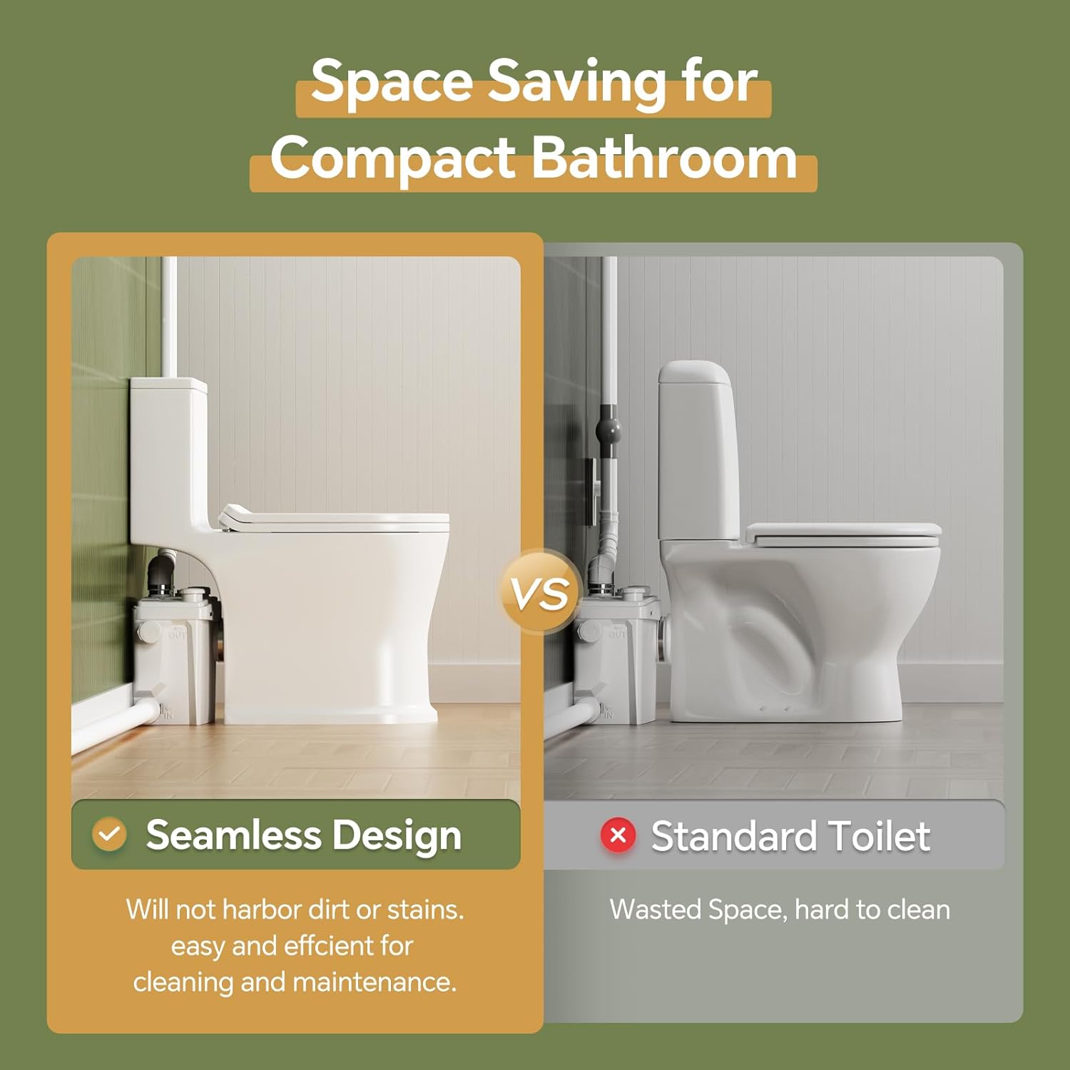 Household 23ft/230ft Lift — Our heavy-duty 500W macerator pump delivers exceptional vertical lift (23 feet) and horizontal discharge (230 feet) performance, efficiently moving wastewater even against gravity. Engineered to handle waste from toilets, sinks, showers, bidets, and appliances, it’s the perfect solution for basement bathrooms or any installation below sewer lines.