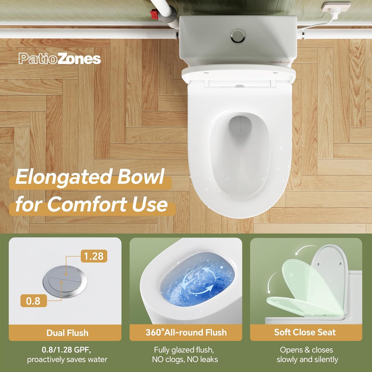 One Piece Full Skirt Toilet — 17.3″ high toilet with a seamless one-piece construction and full skirt design completely conceals the macerator pump behind its sleek profile, eliminating unsightly exposed plumbing while maximizing your bathroom space. The innovative nano-glaze finish not only resists yellowing and stains over time but also creates an ultra-smooth surface that makes cleaning remarkably effortless.