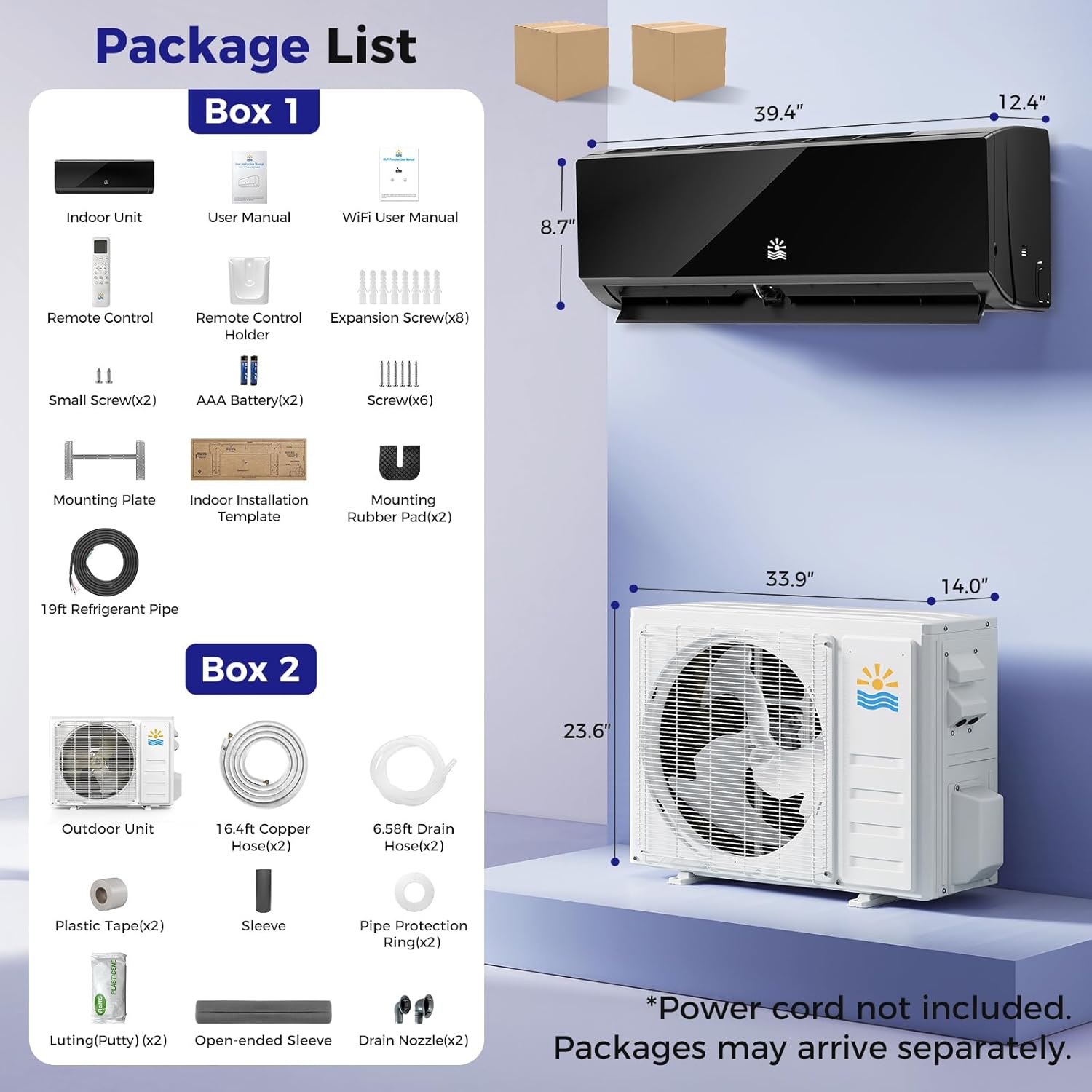 【Smart Control System】Manage all functions through the included remote or via your smartphone with WiFi connectivity. The system features iFeel mode for localized temperature sensing, while the LED display can be turned off for undisturbed sleep. With a 24-hour timer and safety lock, this minisplit AC/heating system offers intelligent, flexible control both at home and remotely.