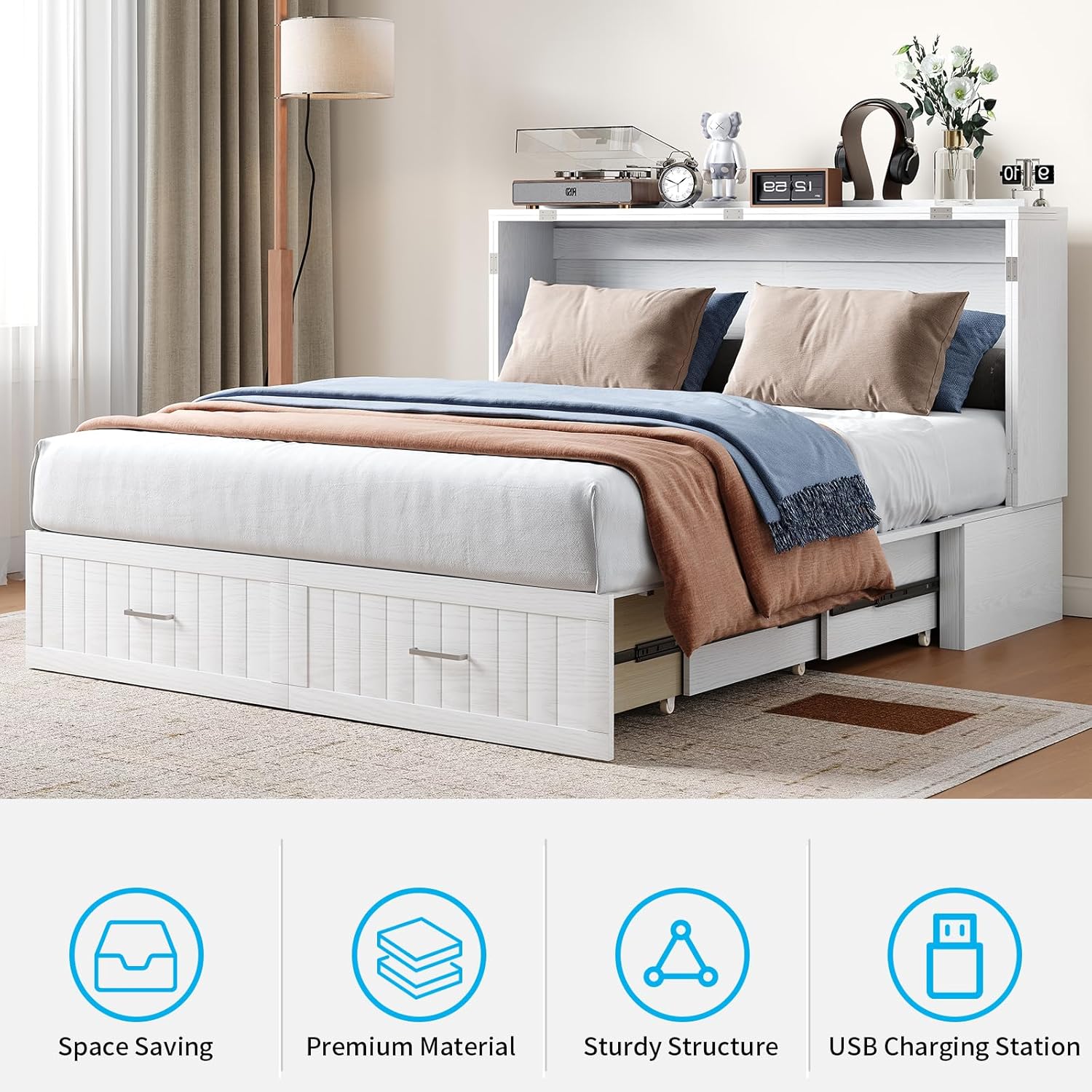 Mjkone Murphy Bed, Queen Cabinet Bed with USB Port and Tri-Fold Mattress, Modern Space-Saving Wall Murphy Beds with 2 Storage Drawers for Bedroom Guest Room Office, White