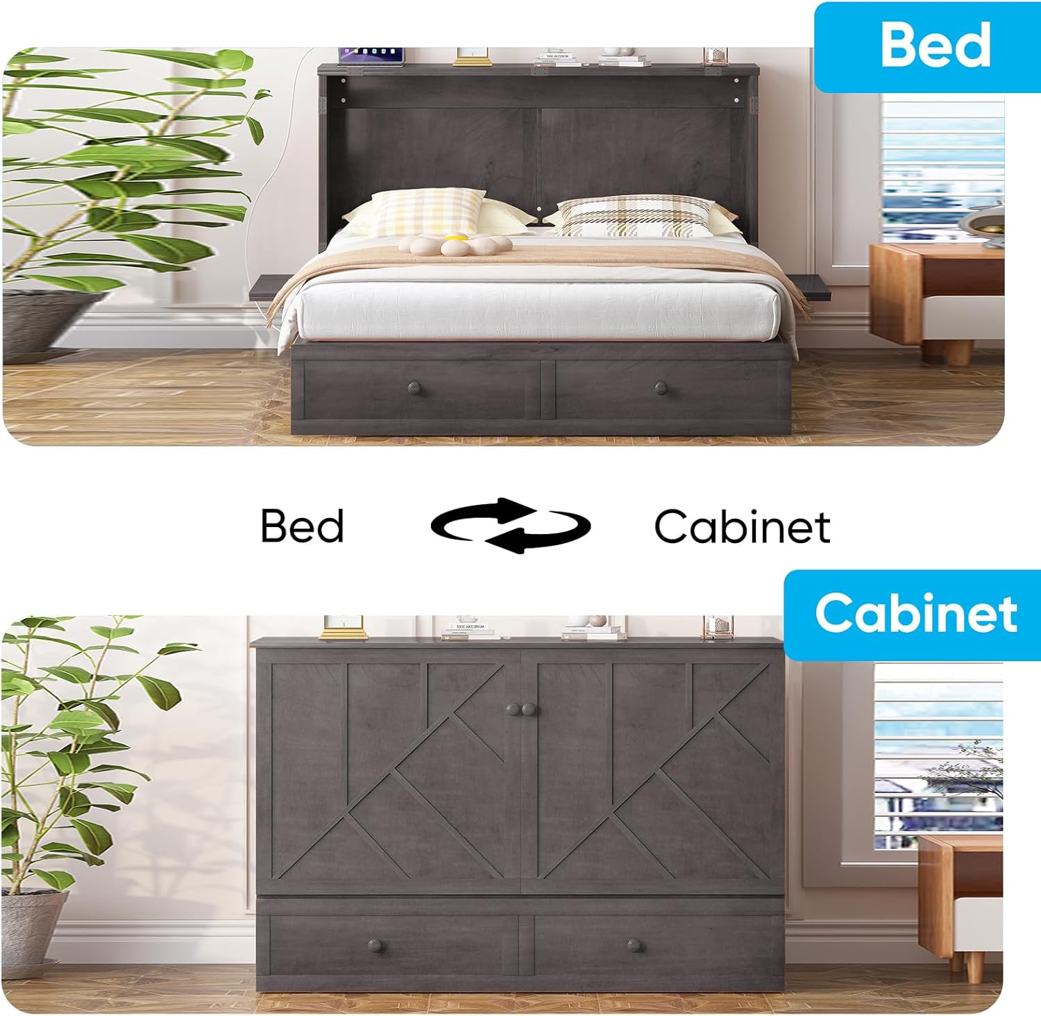 【USB Charging Station】:Stay connected and organized with the integrated USB charging station, designed to power your devices effortlessly. This murphy bed cabinet eliminates clutter from extra adapters and cables, making it ideal for contemporary living spaces, home offices, or guest rooms.The strategically placed ports ensure easy access while charging smartphones, tablets, or other electronics, combining functionality with sleek design to enhance your daily lifestyle.
