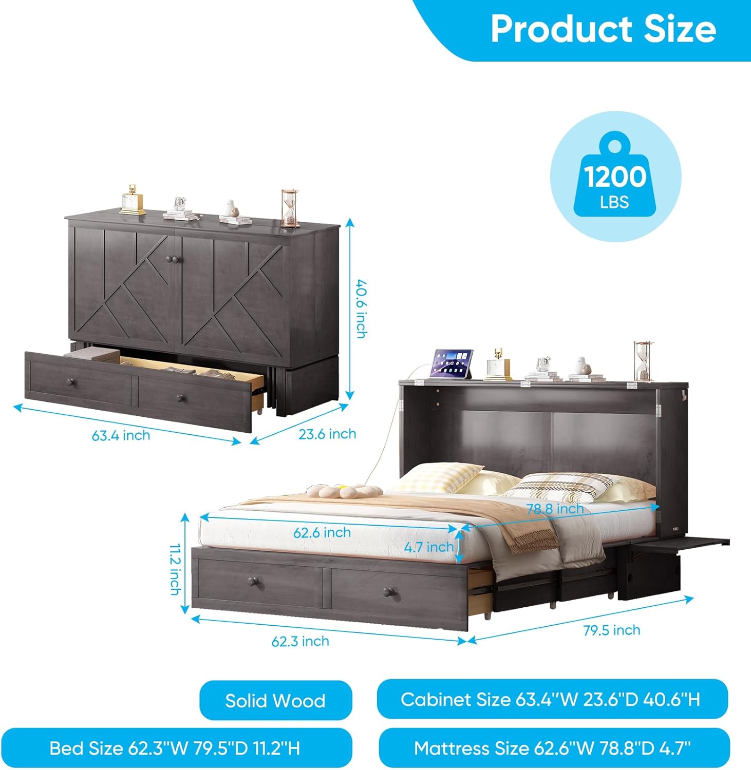 Mjkone Queen Murphy Bed Cabinet, Wall Murphy Bed with Tri-Fold Memory Foam Mattress, Modern Cube Cabinet Beds with USB Charging Station & 2 Large Storage Drawers for Living Room Apartments, Dark Gray