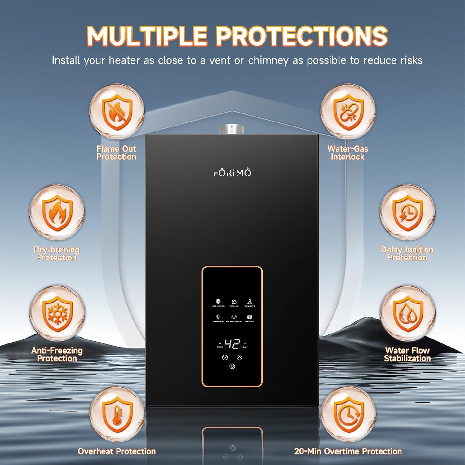 【Quality Material】- Our Water Heater is Crafted from stainless steel, and this Natural Gas Water Heater exhibits high temperature resistance and corrosion resistance. It also features a built-in oxygen-free copper water tank, which helps reduce heat loss and ensures a prolonged service life. It is equipped with an LED smart digital display, allowing you to effortlessly adjust the temperature between 38℃-75℃ according to your preferences.
