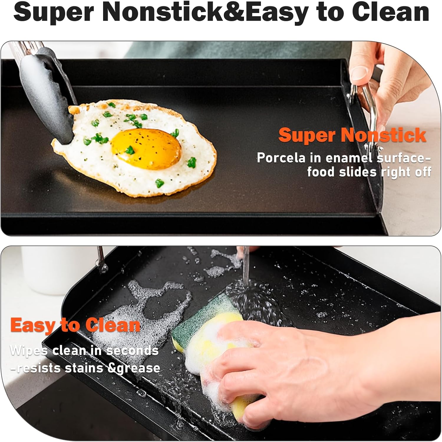 【Upgraded Nano-Ceramic Nonstick Coating】Unlike traditional cast iron or standard nonstick coatings, our nano-ceramic surface is scratch-resistant, eco-friendly, and highly durable. It delivers superior heat distribution with no hot spots and won’t peel or flake over time. Enjoy healthier cooking with less oil, effortless food release, and long-lasting nonstick performance—perfect for pancakes, burgers, seafood, and steaks every time