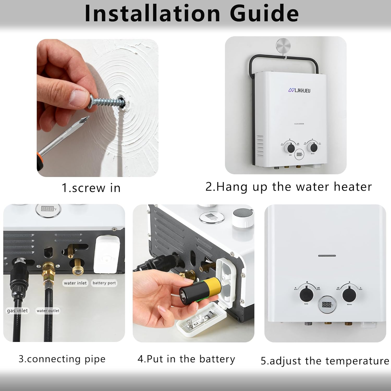 WHATS INCLUDED: 1 x Portable Tankless Water Heater, 1 x Users Manual, 1× CSA Certified Gas Regulator and Hose,1× 5 Feet On/Off Switch Shower Head,1× Mounting Hardware, 2× Garden Hose Adapter. It only takes you a few minutes to install it. Read the directions before installation check for gas leaks at all times before operating.