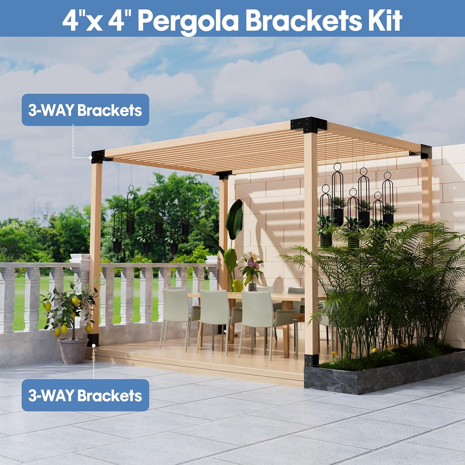 3-Way Pergola Brackets Kit: Upgraded 3-Way right-angle pergola brackets boost pergola stability in harsh weather. Designed for 4″x4″ lumber, the brackets are weather-resistant and sturdy, no need to worry about storm or wind damage