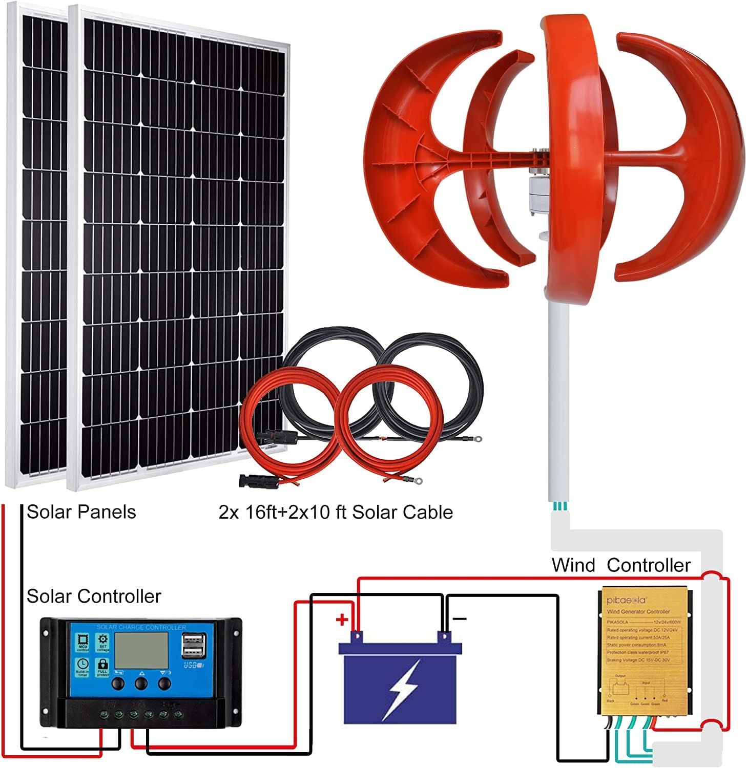 Pikasola Wind Turbine Vertical Axis Generator 200W12V + 2 PCS 100W 12V Monocrystalline Solar Panel Kits Suit for RV Marine Home Solar Wind Hybrid System