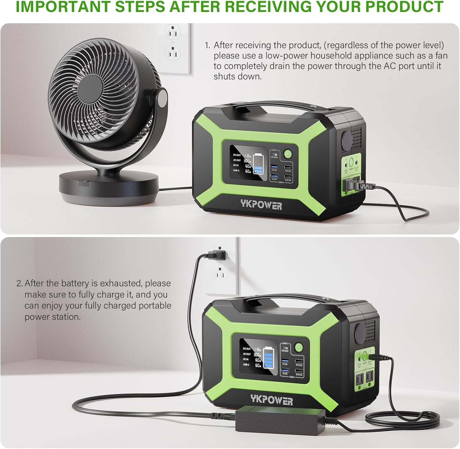 𝗪𝗵𝗮𝘁 𝗬𝗼𝘂 𝗚𝗲𝘁 1x YKPOWER 300W Portable Power Station, 1x AC Power Adapter, 1x User Manual. Not include car charger cable and solar panel. For better battery maintenance, please fully charge it every 2-3 months when not using it