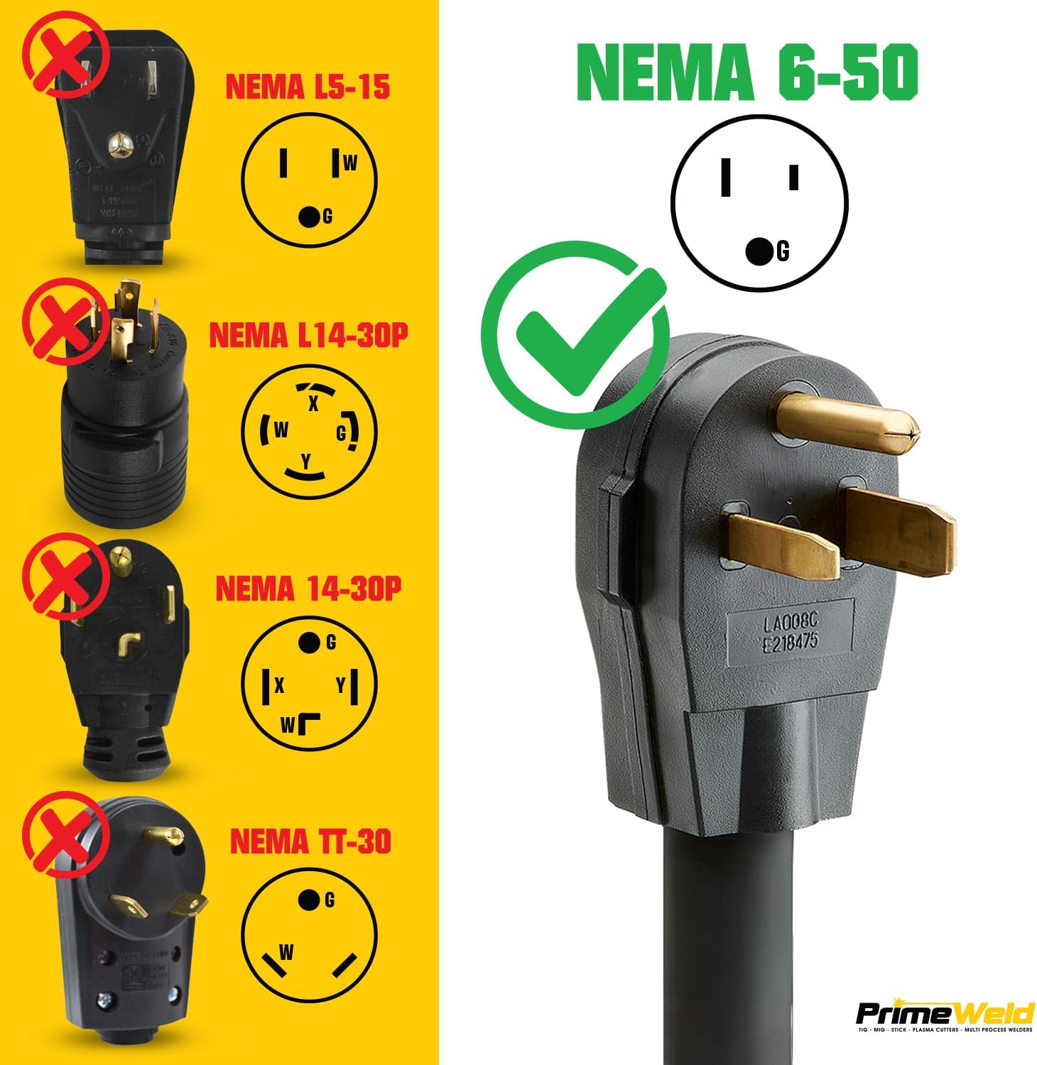 Welder 3-prongs NEMA 6-50 lighted connector right-angle, 50 Amp / 250 Voltage / 12500 Watts. For use with any welder or plasma cutter with a 6-50 NEMA plug