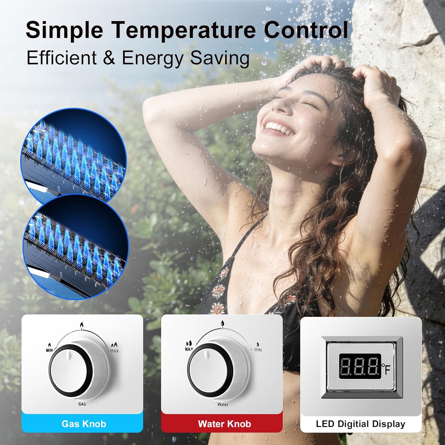 Tankless water heater gas with Steady Hot Water Flow Powered by a 34,000 BTU system, this tankless water heater gas delivers a consistent 5 L/min (≈1.32 GPM) and temperature rise of 55.4°F–109.4°F (13°C–43°C)of instant hot water. Ideal as a propane water heater tankless for showers, dishwashing, and cleaning, this on demand propane hot water heater ensures adjustable temperature control for all your outdoor needs