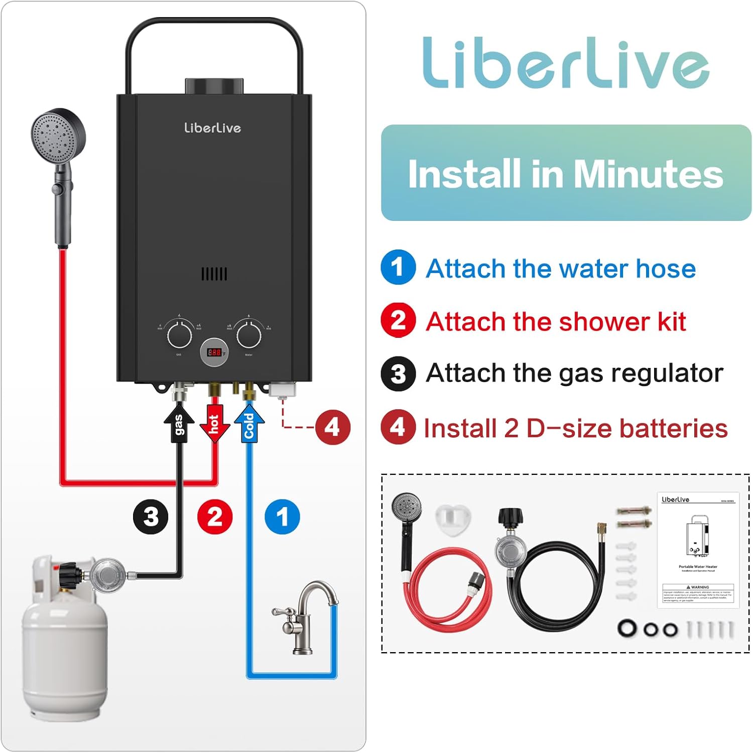 [PACKAGE CONTENTS] – This portable water heater of ours comes with a 1-year warranty, 5 feet of premium on/off shower head with 5 spray patterns, 5 feet of CSA certified gas regulator, installation hardware kit and installation instructions. Installation of this propane water heater takes only 10 minutes. Water inlet & water outlet: 1/2″ NPT, Gas inlet: 1/2″ NPT with 5/8″ NPT adapter