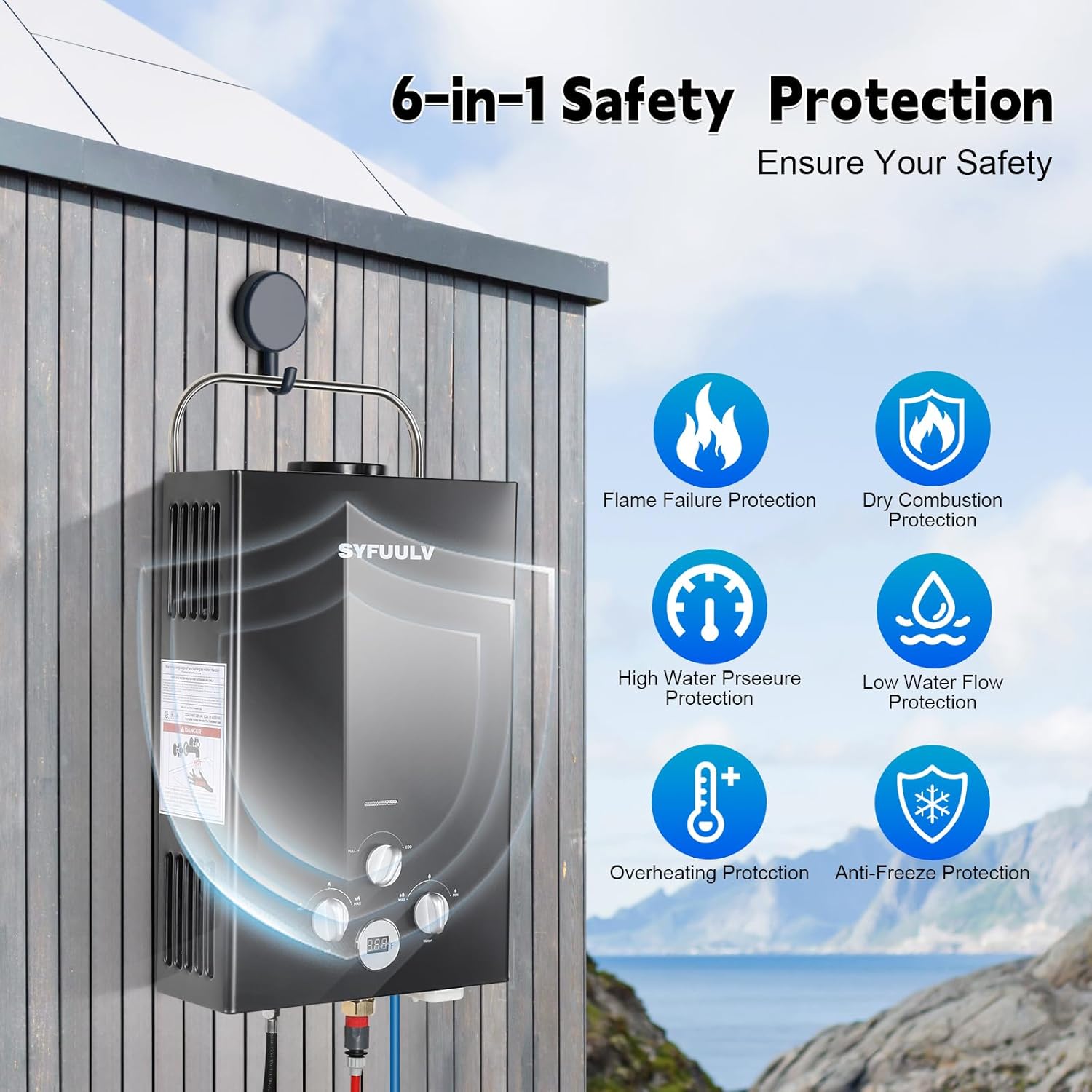 Powerful Instant Heating, Stable Hot Water Supply : This propane water heater with a 41,000 BTU burner and 3-second instant heating technology, Syfuulv propane instant hot water heater delivers hot water without delay. The 1.58 GPM (6L/min) high-flow design ensures a steady hot water output