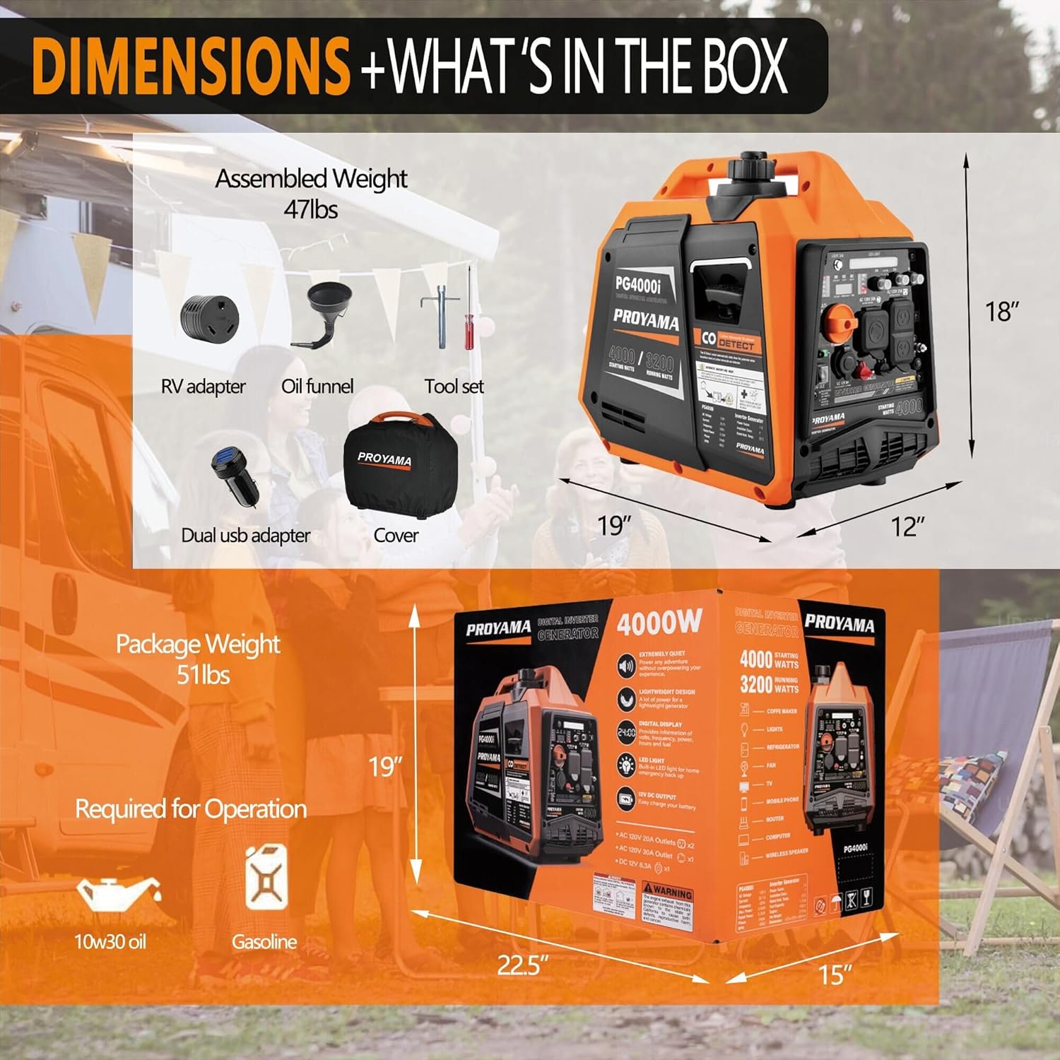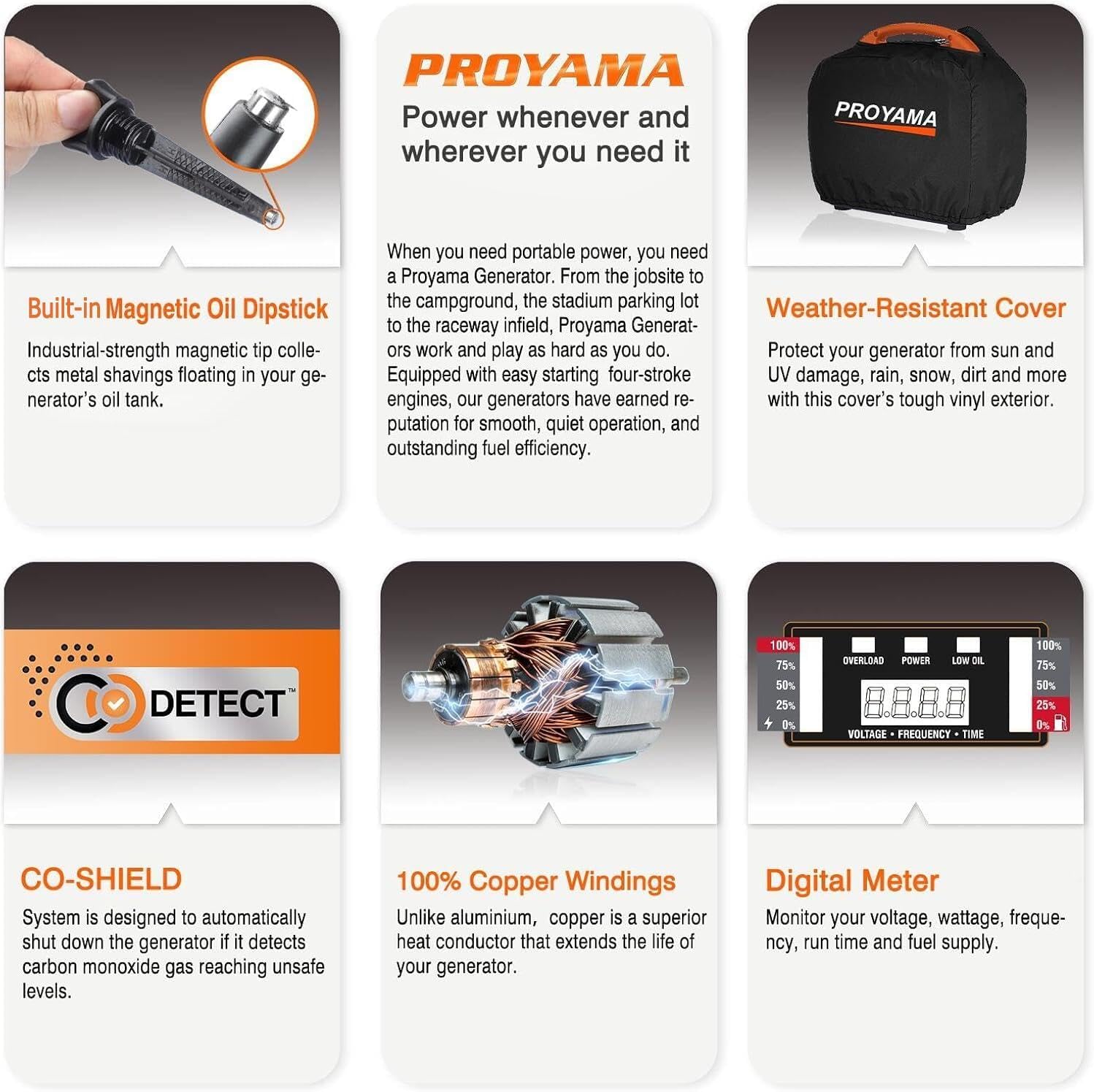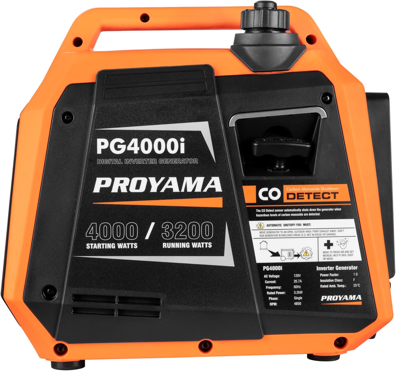 PROYAMA 4000W Portable Gas Inverter Generator, CO Sensor, Digital Interface, RV – Ready, LED Light, ECO – Mode, Parallel Capable, Low Oil Shutoff, Super Quiet and Lightweight with Weatherproof Cover