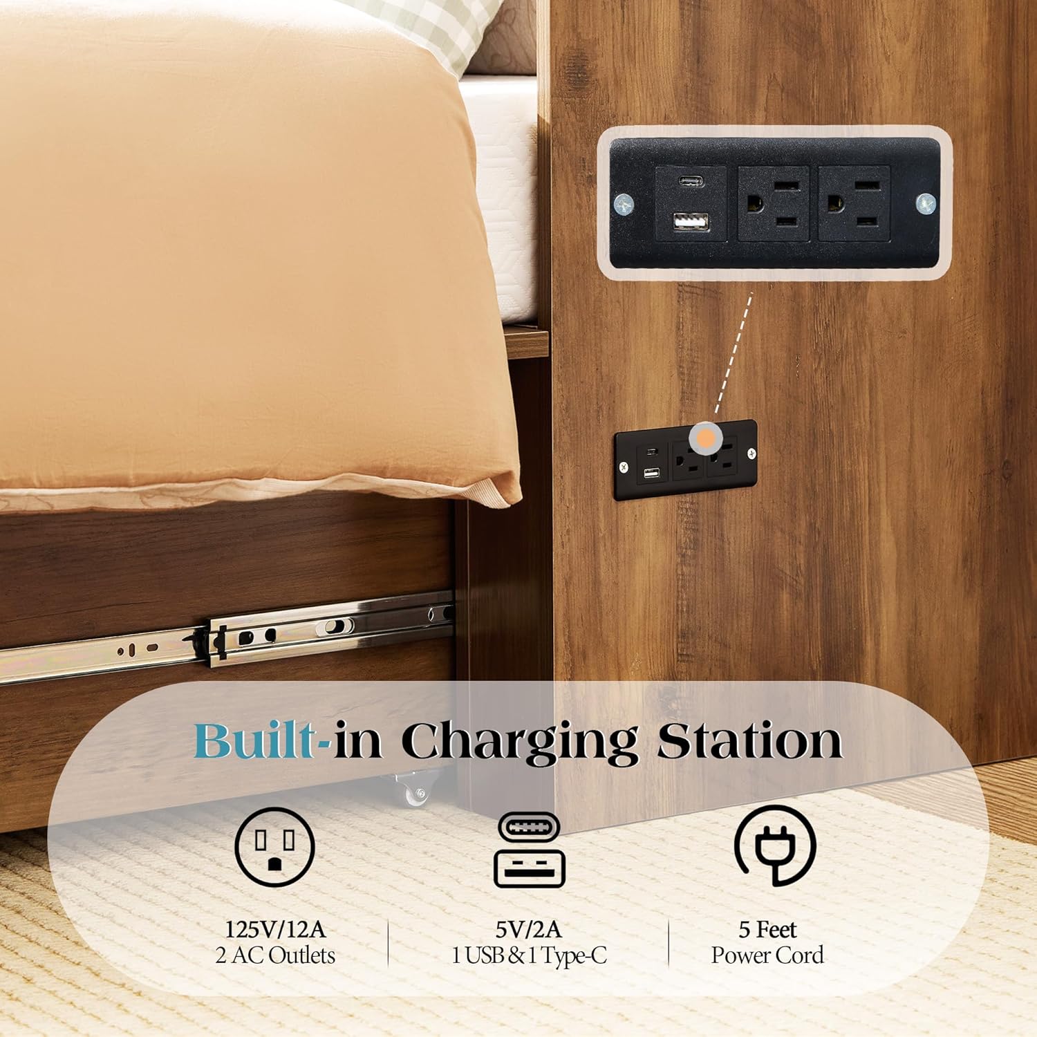 【Built-In Charging Hub】Features 2 AC outlets, 1 USB, and 1 Type-C port—charge your phone or laptop directly from bed without messy cords or adapters. Great for working, relaxing, or reading at night
