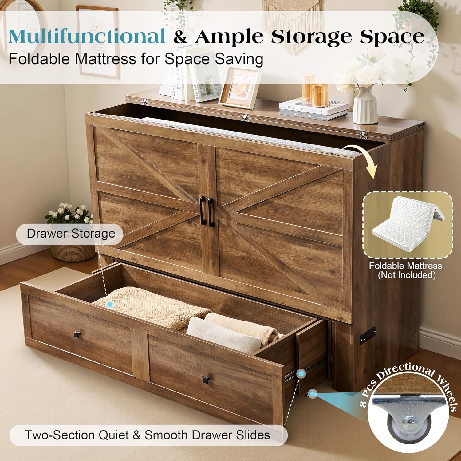 【Space-Saving Murphy Design】Transforms from a farmhouse-style cabinet into a cozy queen bed—perfect for small spaces like guest rooms, home offices, or apartments. Mattress not included
