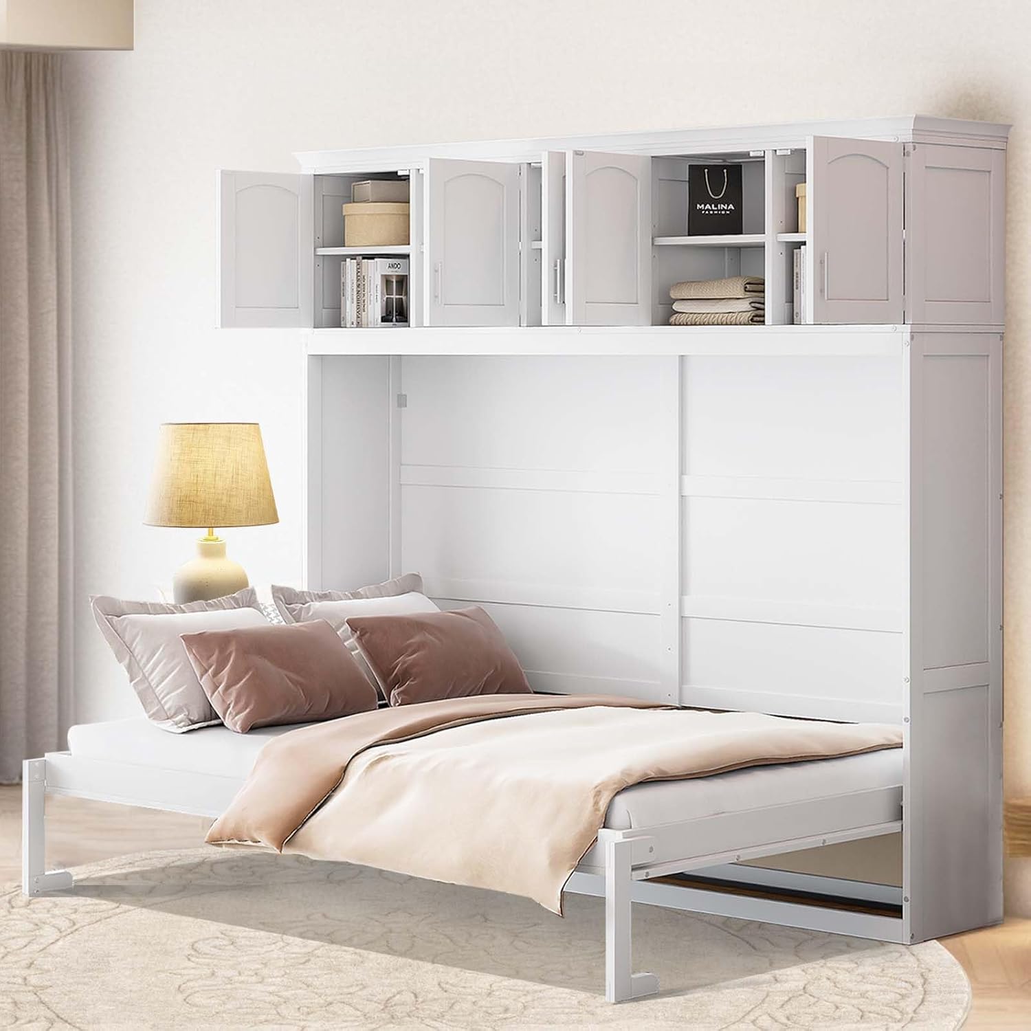 Wall Bed with Top Cabinets: Simply pull the handles and flip the support leg to set up the bed. The 2 top cabinet has 5 doors and 10 compartments for storing clothes, bedding, or books. It is both fashionable and practical, and is a good helper for saving space.