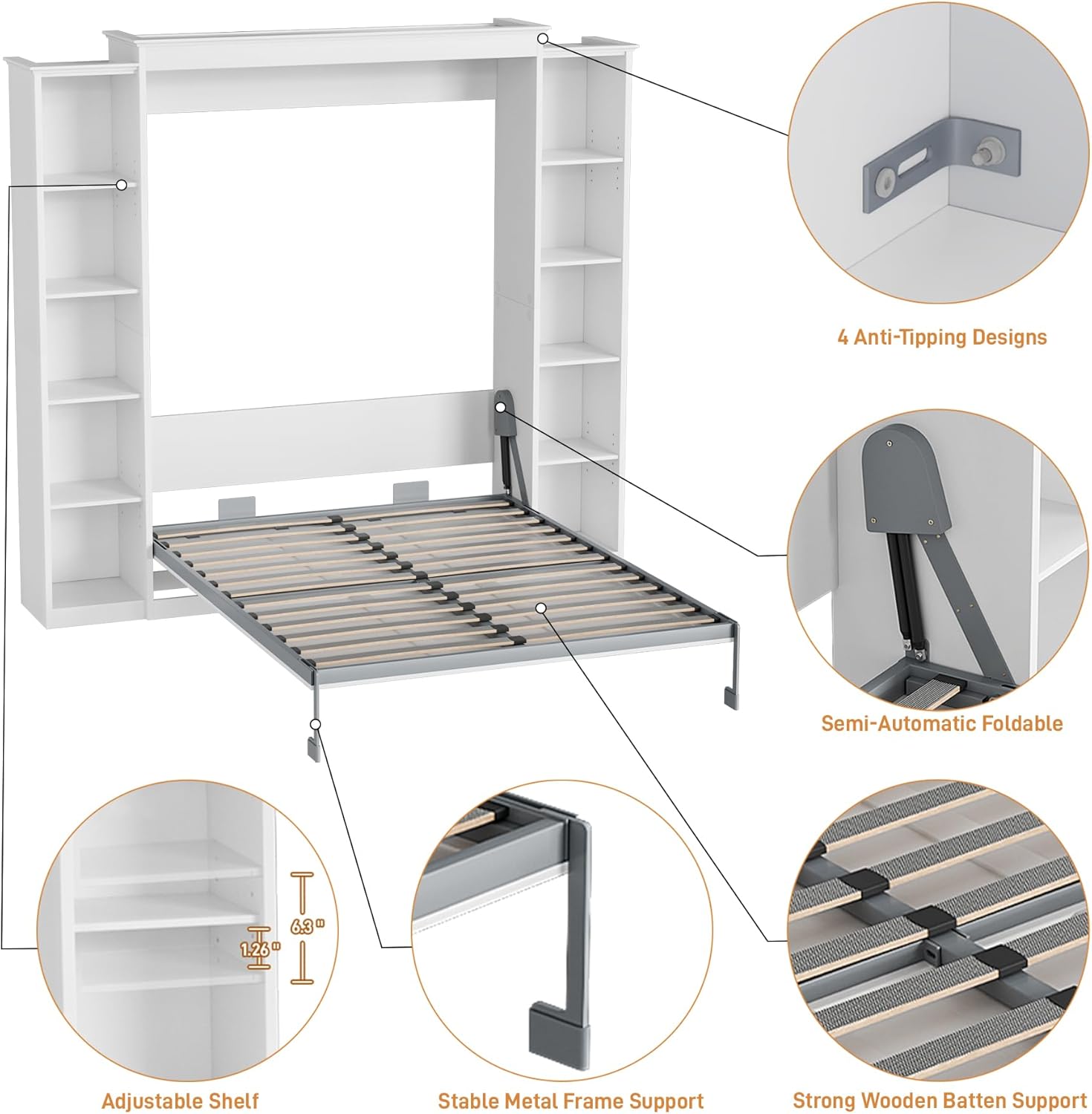 【Murphy Bed with 2 Storage Shelves】- Features one spacious 5-tier storage shelves on each side, And 2 of the partitions can be moved up and down, allowing you to freely adjust the height of the storage you need. offering plenty of room for books, clothes, and other essentials.