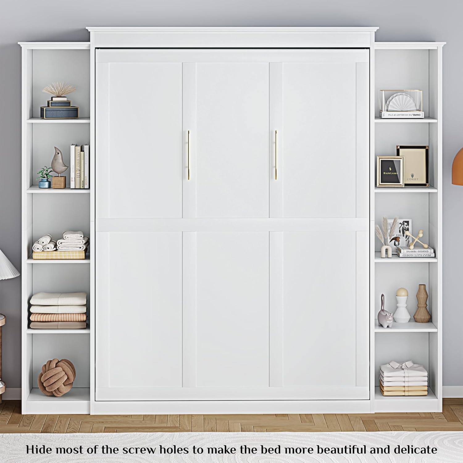 Rophefx Queen Murphy Bed Cabinet with 5-Tier Adjustable Storage Shelves, Wood Queen Wall Bed Cabinet Bed, Space Saving Beds, Hidden Bedframe, Foldable Platform Beds for Guest Room, Bedroom, White