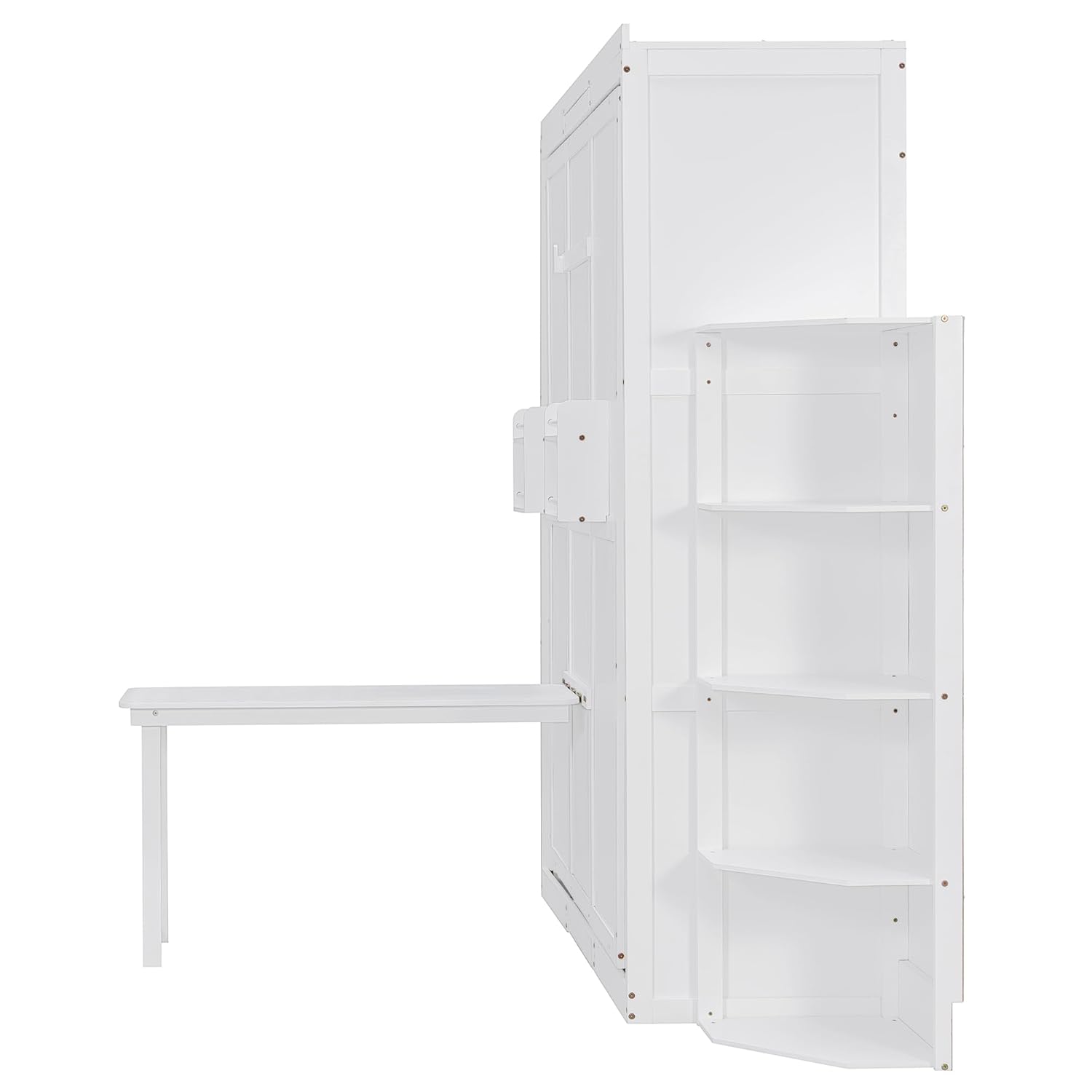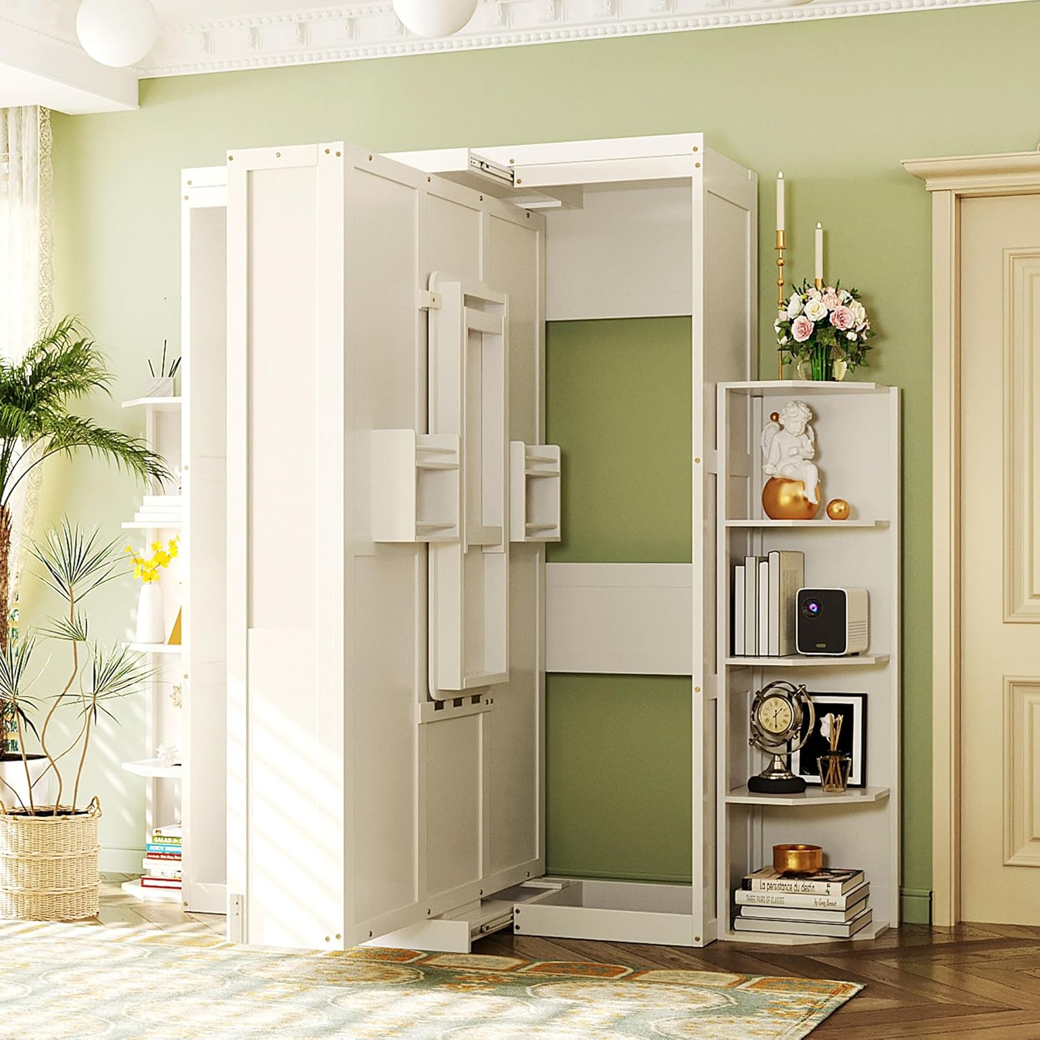 Rotating Murphy Bed Queen Size Hideaway Wall Chest with Cabinet,Dual 3-Tier Side Shelves,Convertible Desk,Space-Saving Wall Murphy Bed w/Extra Storage Racks,Bedroom Bedframe for Guest Room,White