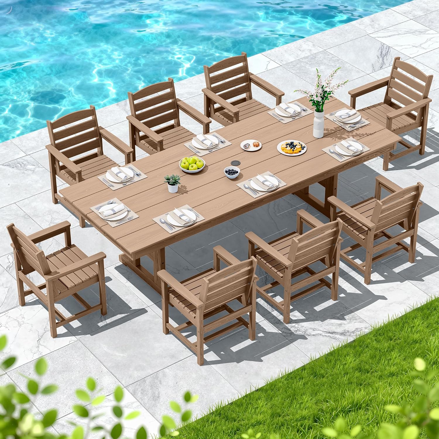 This outdoor dining set features a realistic wood-grain texture and sleek lines that blend seamlessly into any outdoor dining space