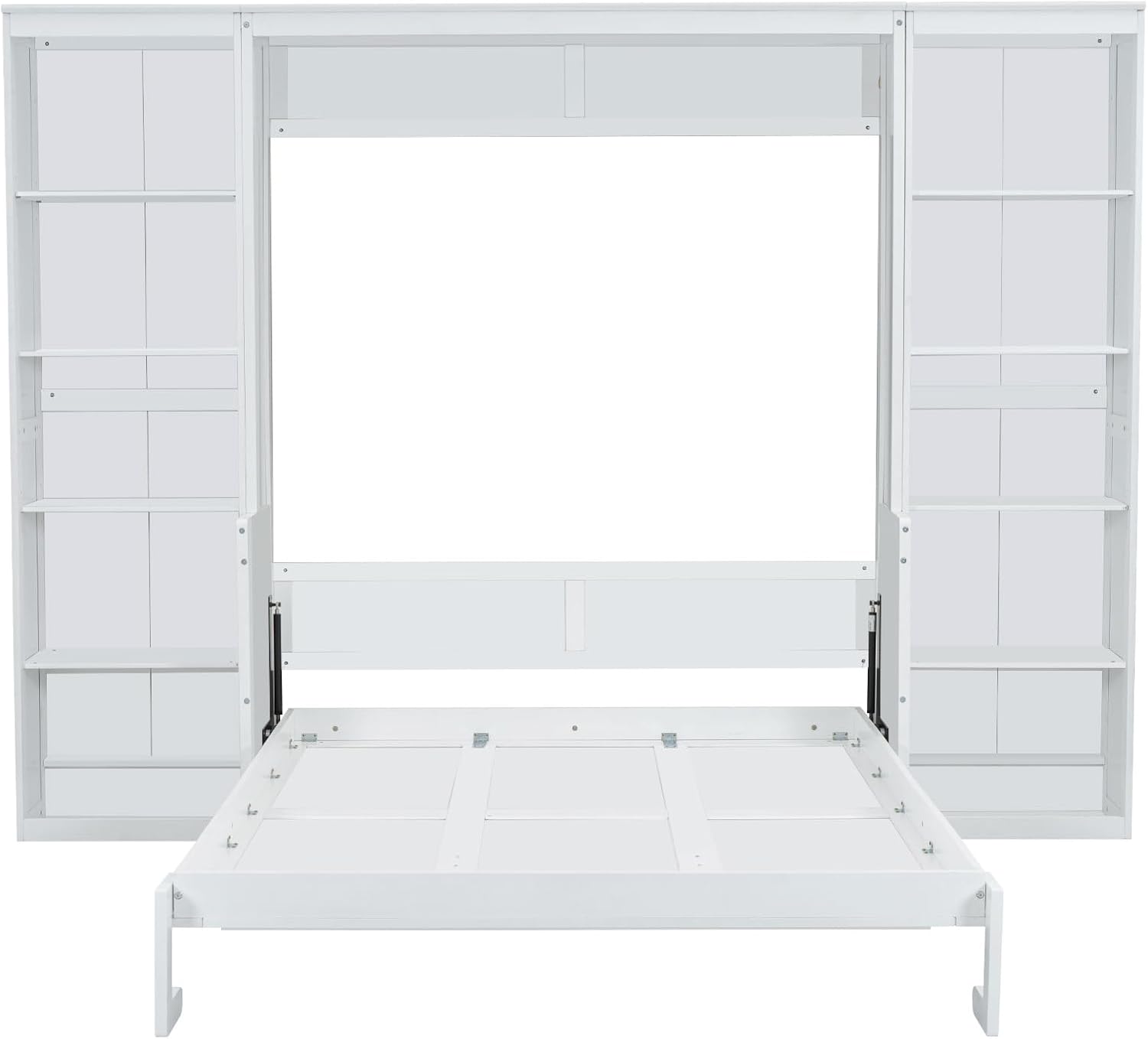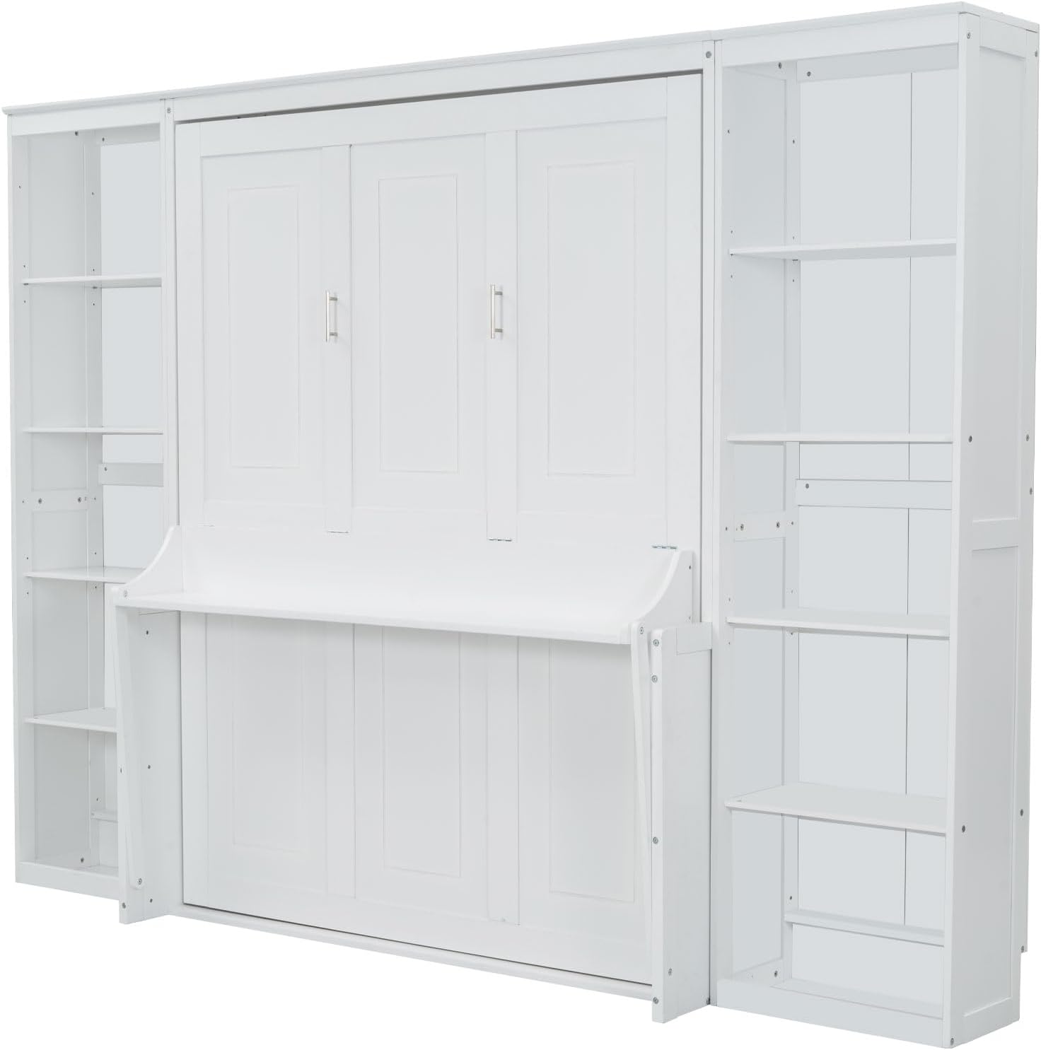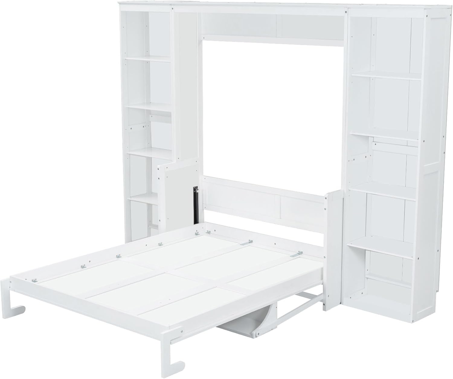 SOFTSEA Queen Size Murphy Bed with Desk, Space Saving Foldable Wall Bed Frame with Storage Shelves, Hideaway Wall Murphy Bed Cabinet for Small Room, Guest Room, White