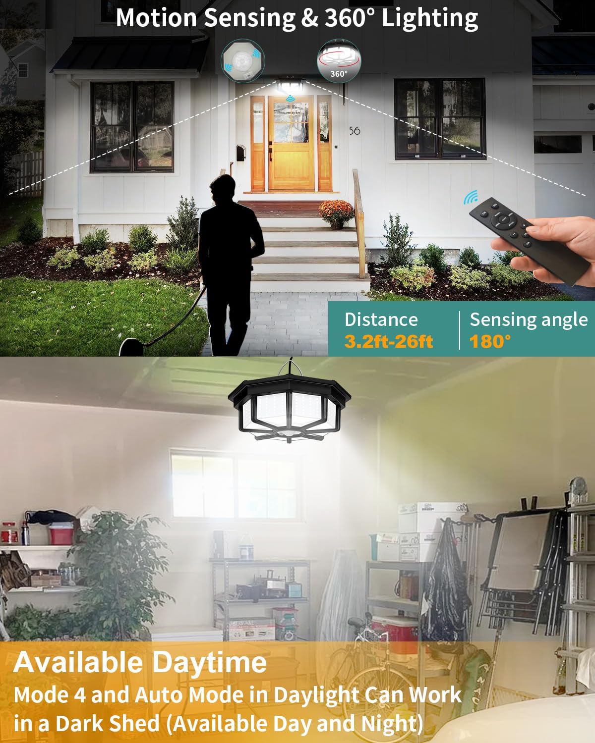 Solar Shed Light Indoor Outdoor 288LED 360°Lighting Solar Lights Work in Daytime with Remote Control, Waterproof Solar Gazebo Lights with Motion Sensor/5 Modes for Home Shed Garage Barn