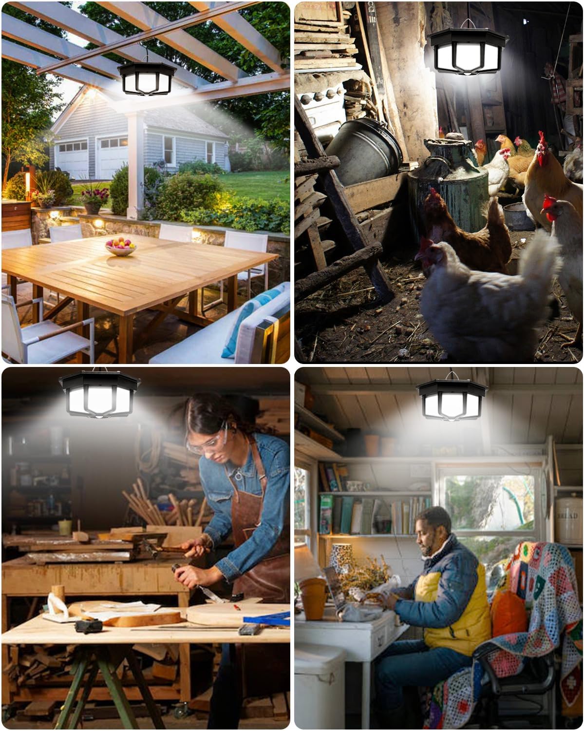 【288 LEDs Super Bright & 360° Lighting】This solar garage light features an eight-sided design with 288 LEDs that provide up to 1200 lumens of high brightness, 360° illumination range and clearer brightness than other similar solar garage lights. The high conversion rate solar panel can provide 10-20 hours of lighting when fully charged. Meet the best lighting choice for carport without power.